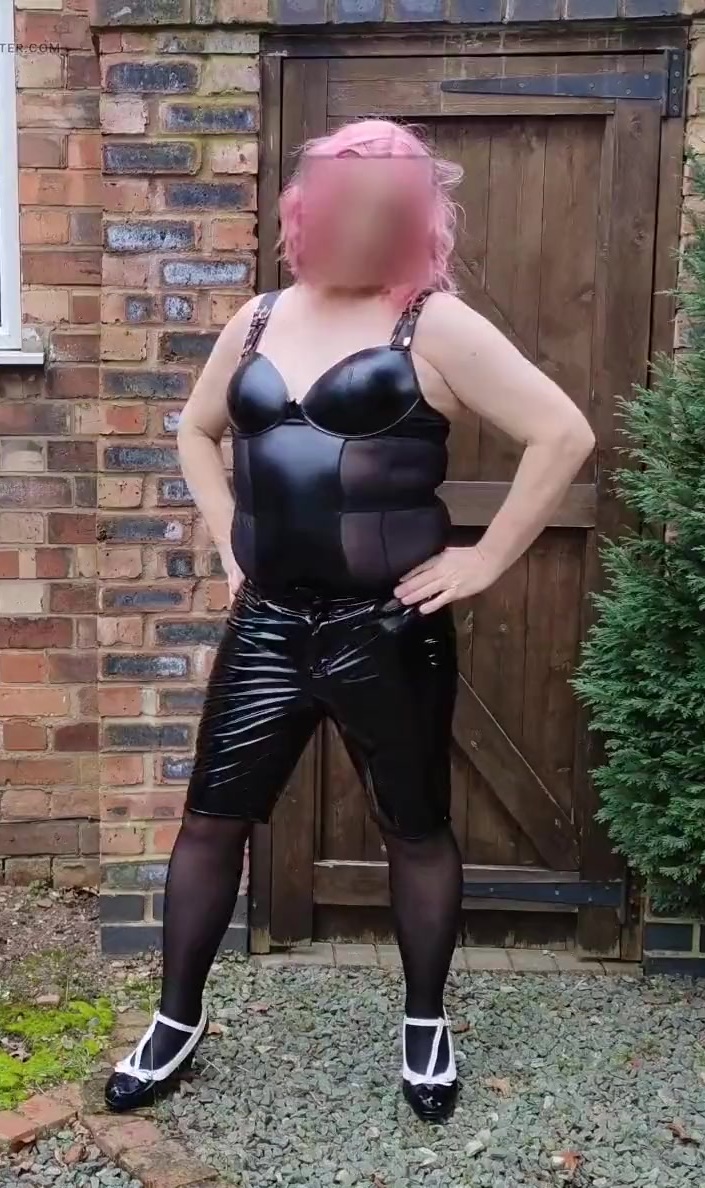 Tranny crossdresser slut Nottstvslut in pvc shorts and bodysuit outdoors.