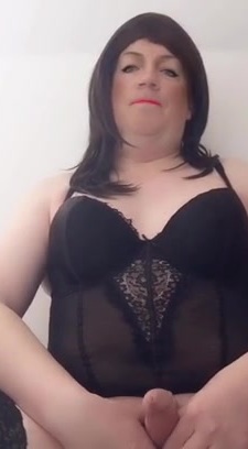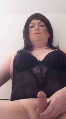 Nicki-Crossdress Close-Up in sexy black Lingerie & Stockings stroking big Cock - Nylon