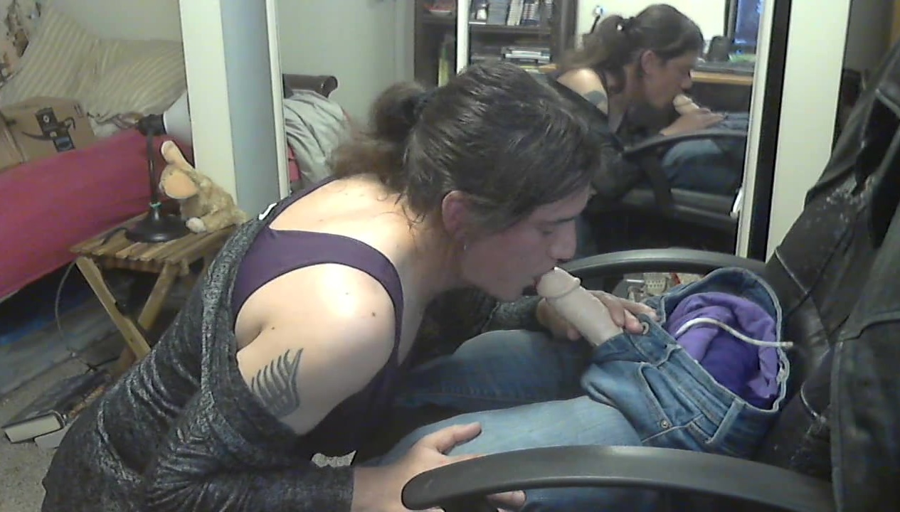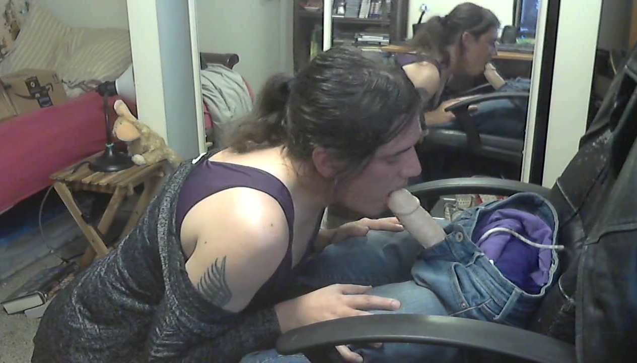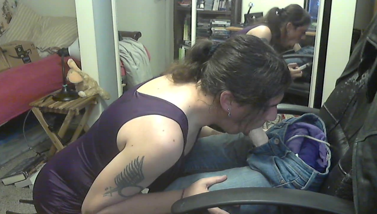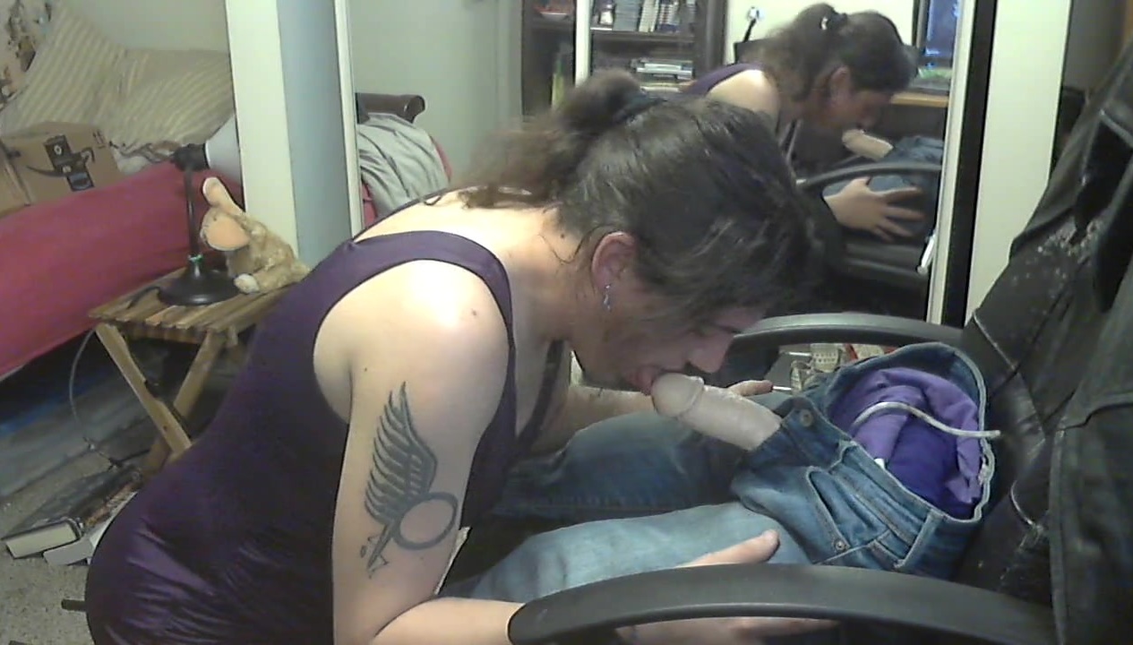 Jenn sucks the cum out of her boyfriend while wearing her sexy purple dress