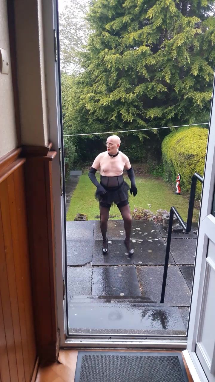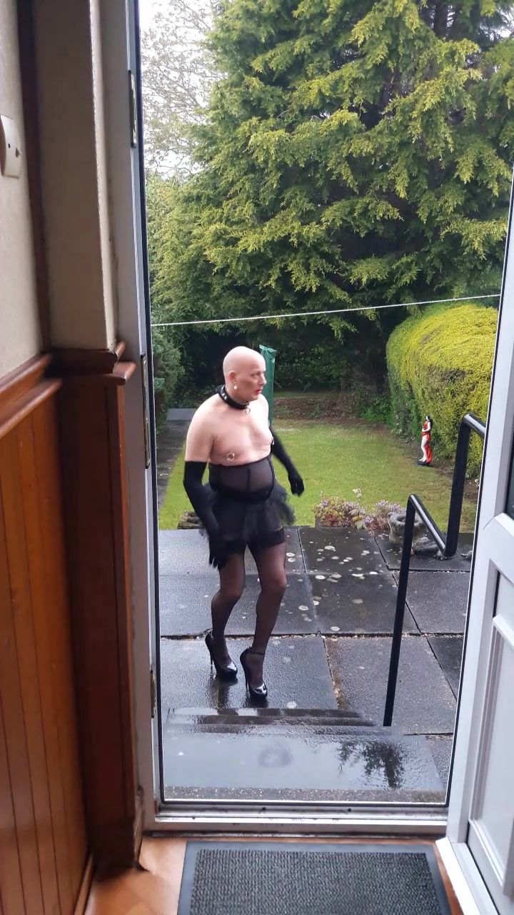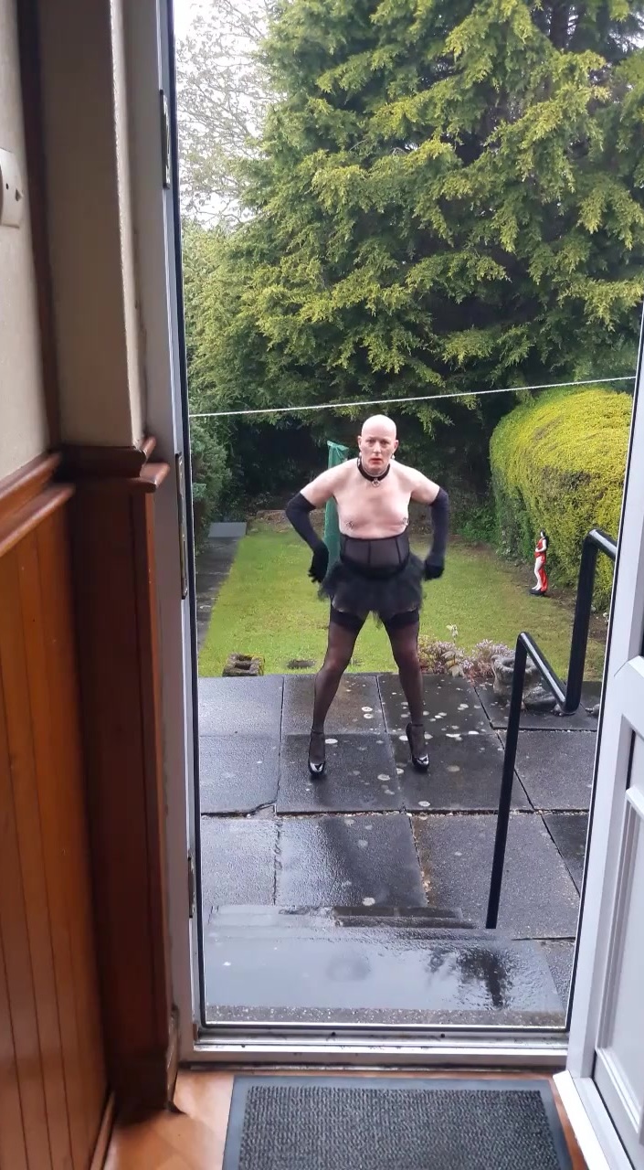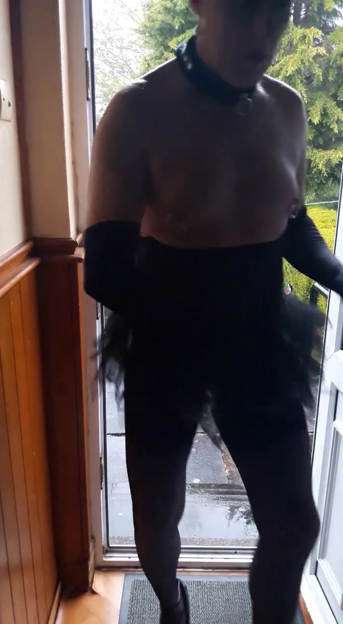 EXPOSING MYSELF TO MY NEIGHBOURS AS A SISSY DARE. DRESSED IN BLACK LINGERIE, STOCKINGS AND HEELS, CHASTITY BELT AND LARGE RINGS IN MY PIERCED NIPPLES
