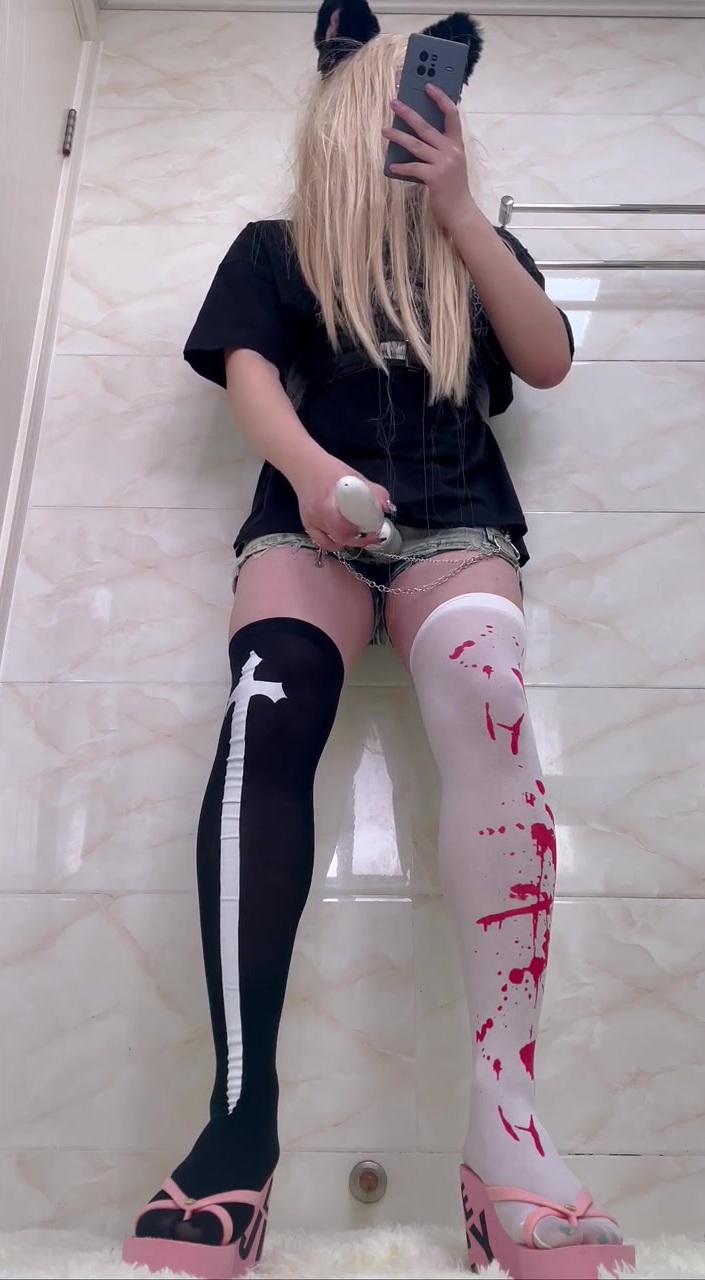 Crossdresser Goth Meow dressed in jeans cut-offs peeing and jacking