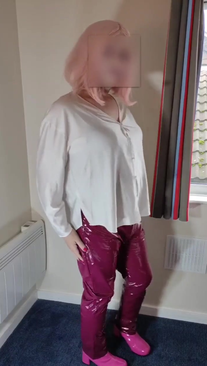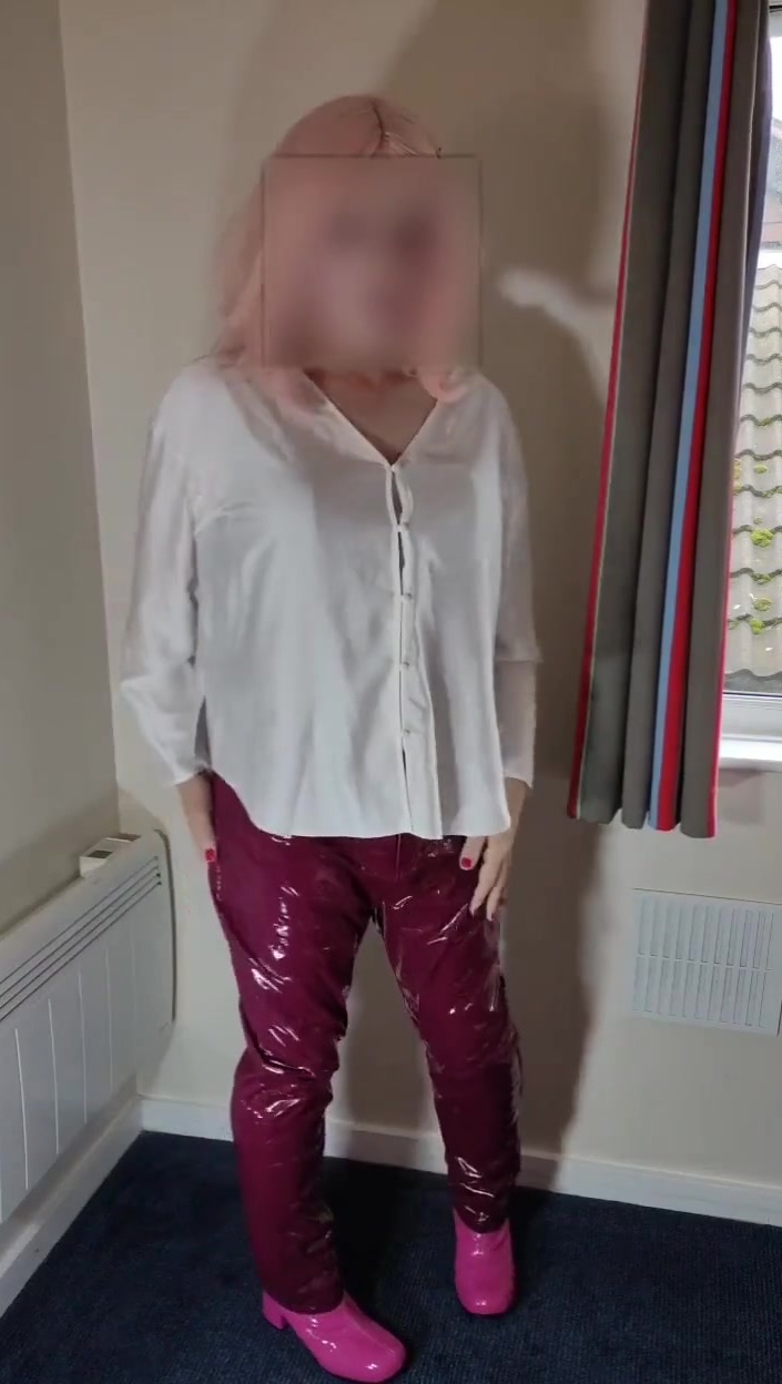 Hot tv crossdresser Nottstvslut in sexy shiny pvc pants and satin blouse