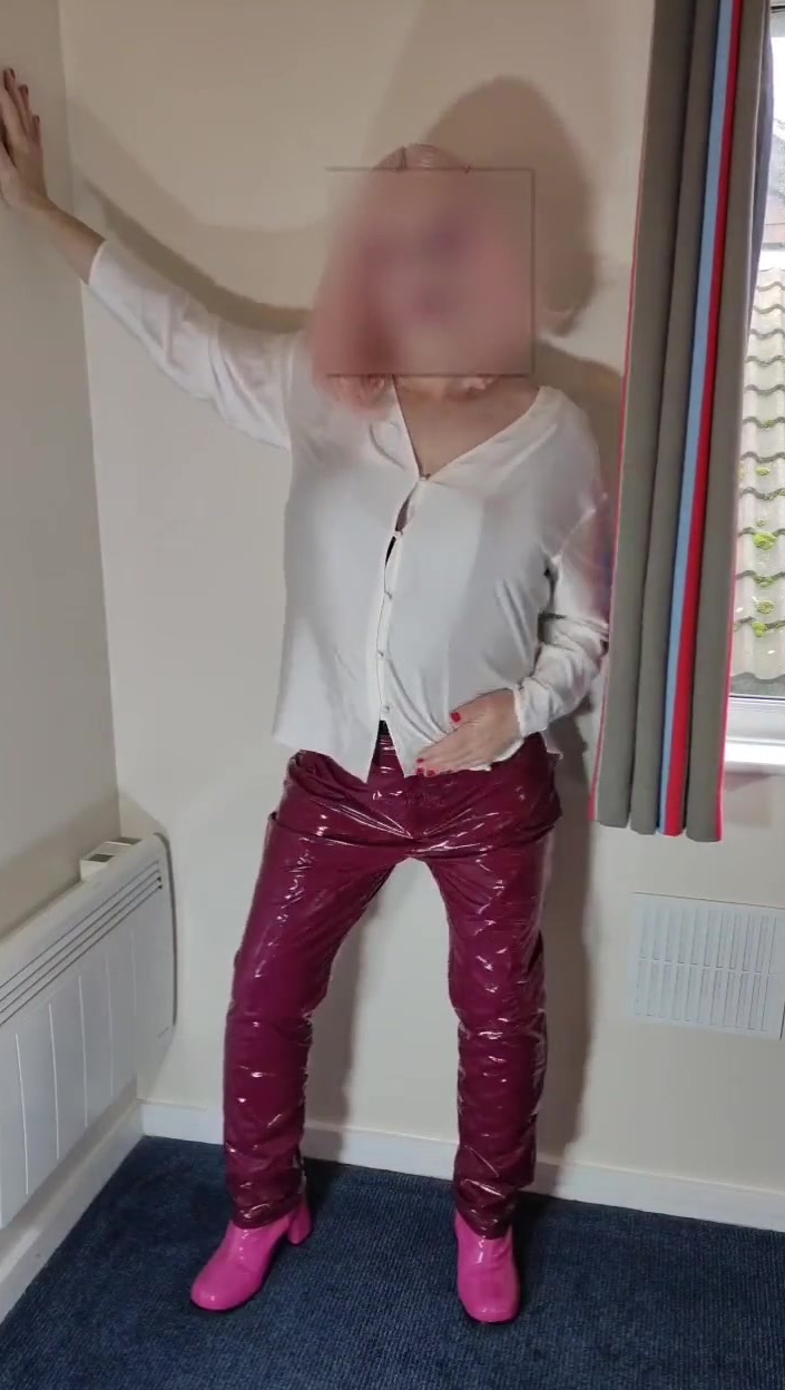 Red-Hot crossdresser vinyl trousers and satin half-top