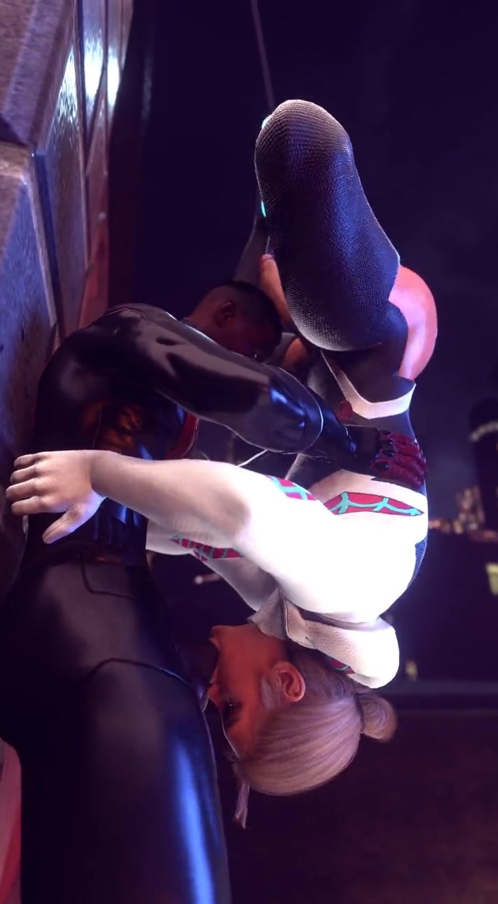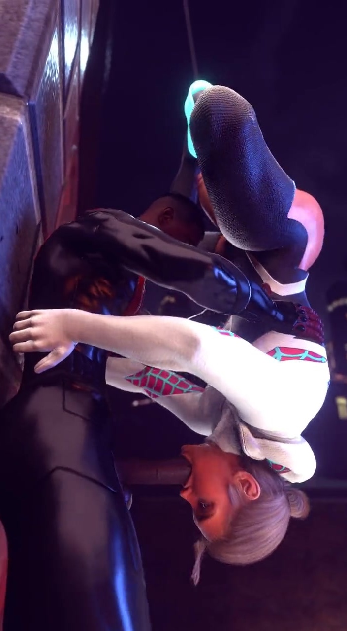 In this animated gay porn scene, Miles Morales is getting a blowjob from a male character who is wearing a Spider Gwen suit. The scene takes place on the side of a building at night, with the characters positioned in a classic Spiderman kiss pose.