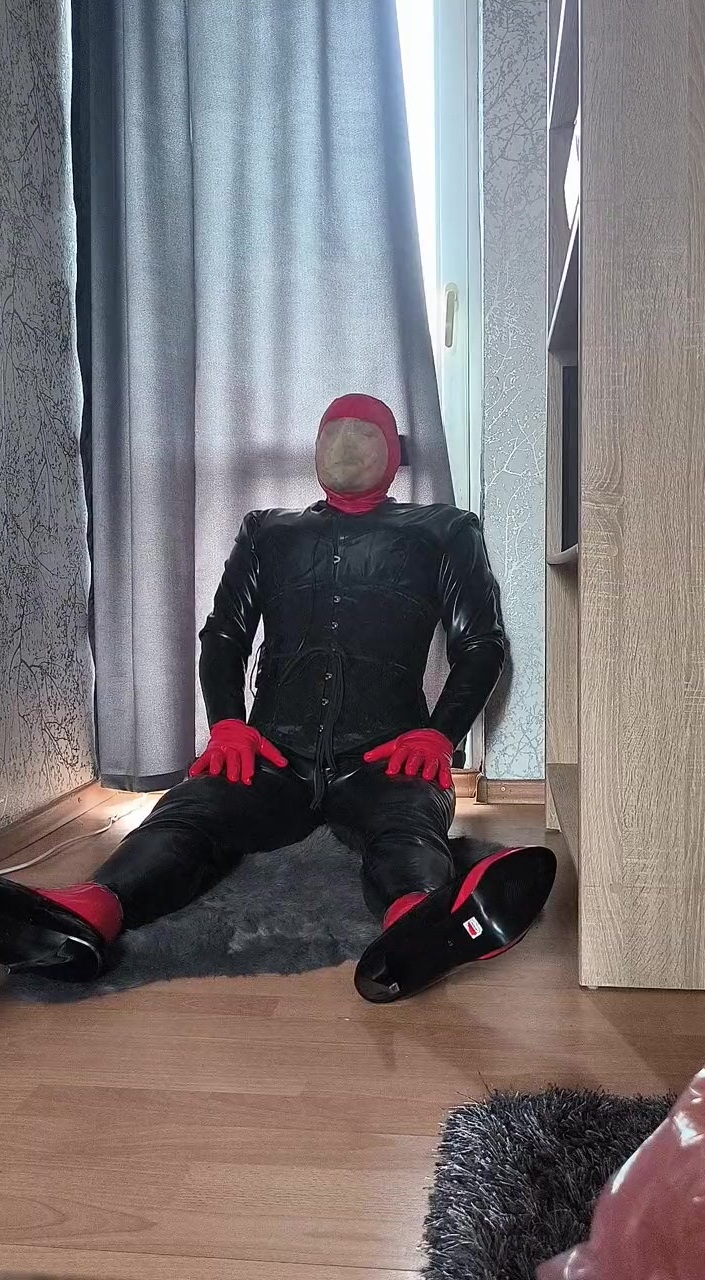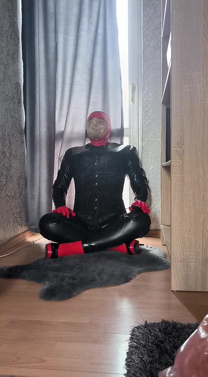 Hubert Kate wearing latex catsuit, latex gloves, corrsets, heels, doing solo breath play in latex mask