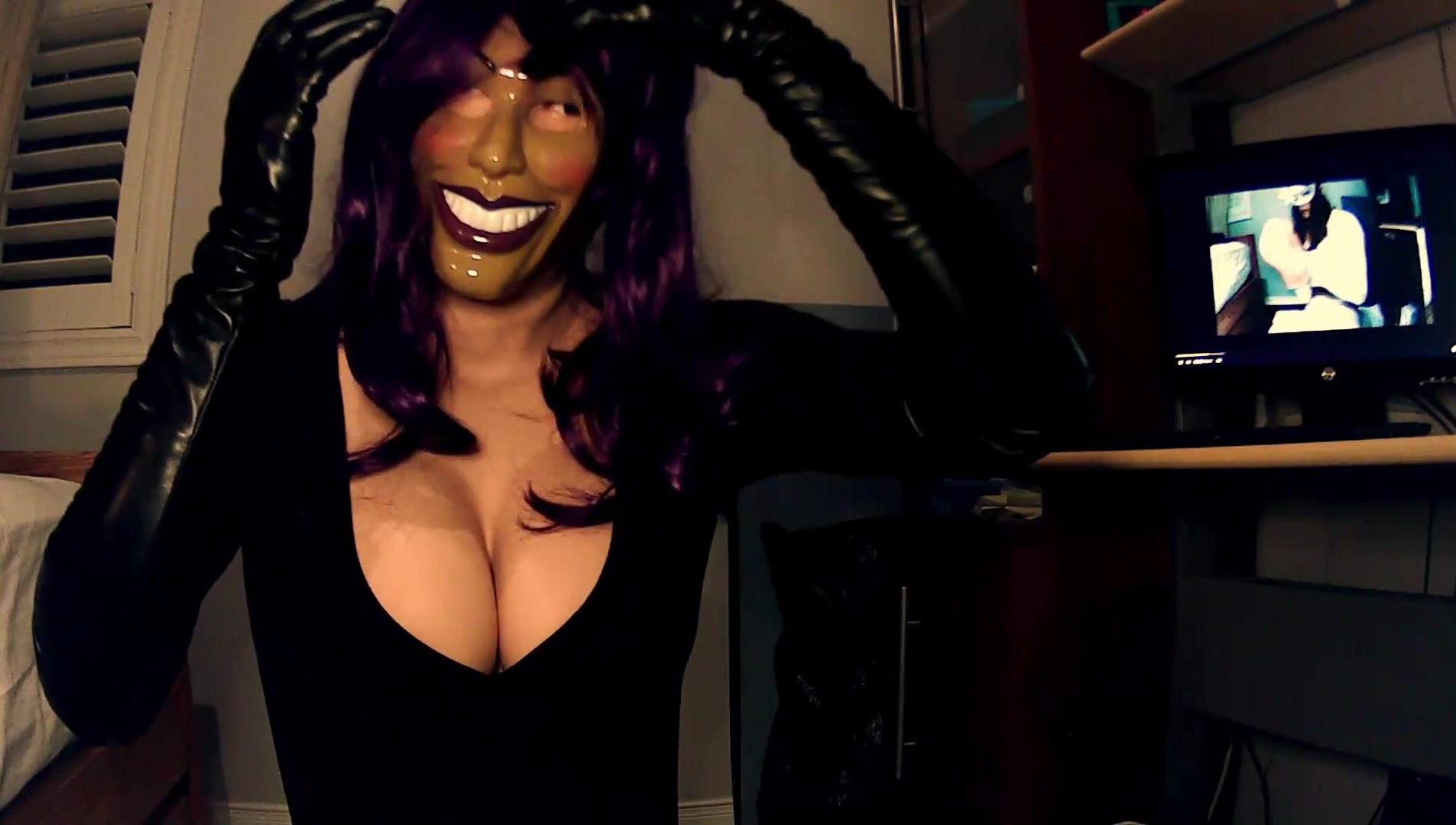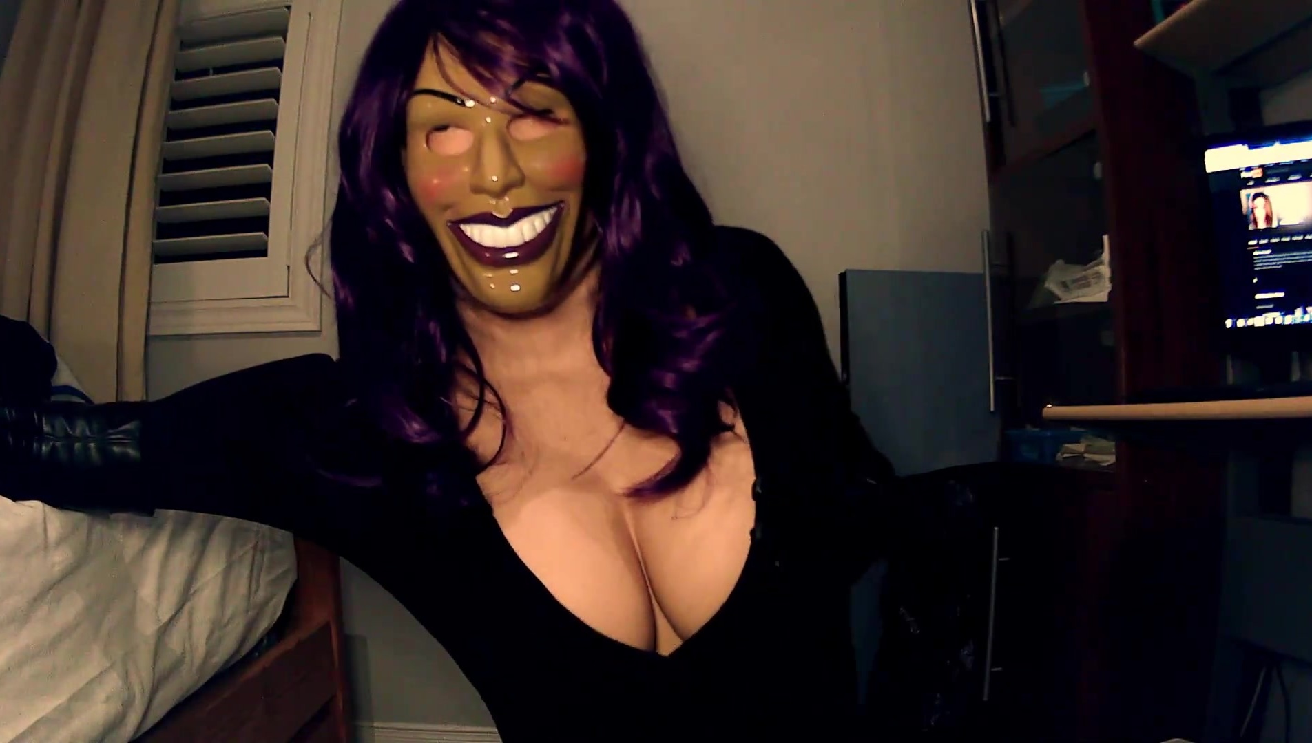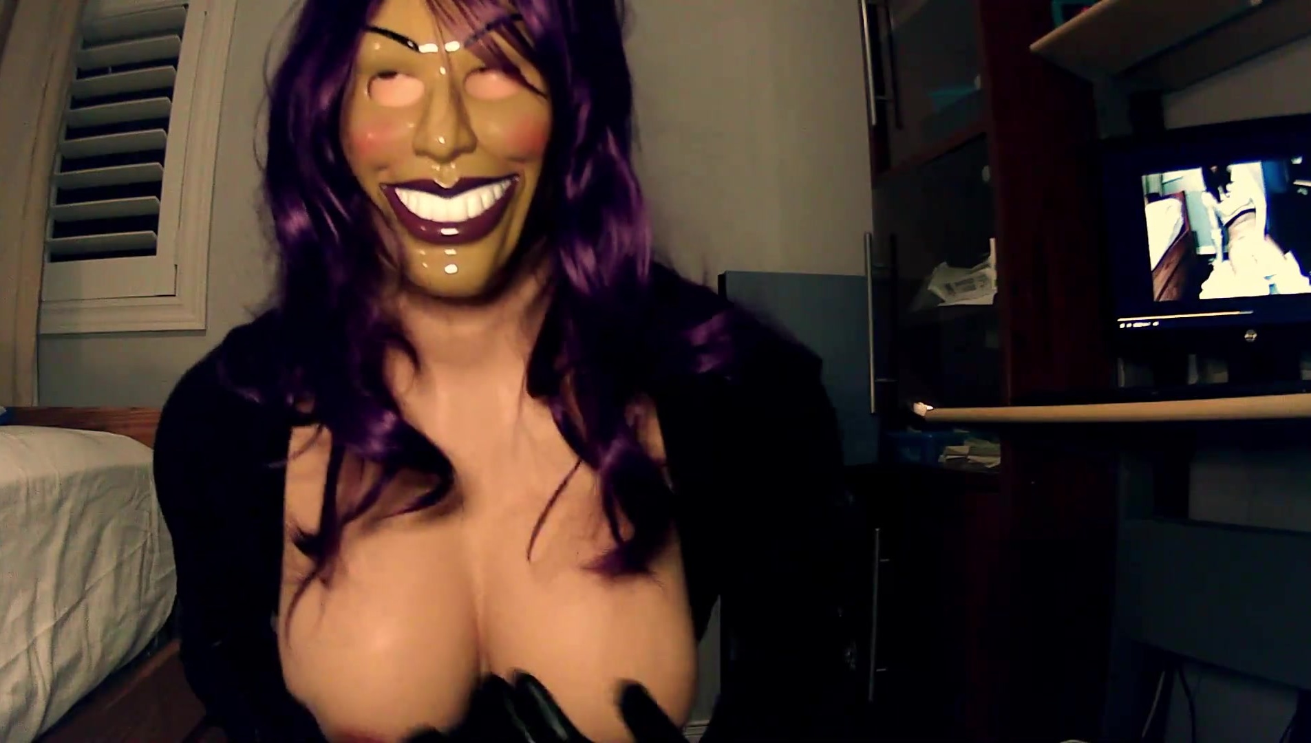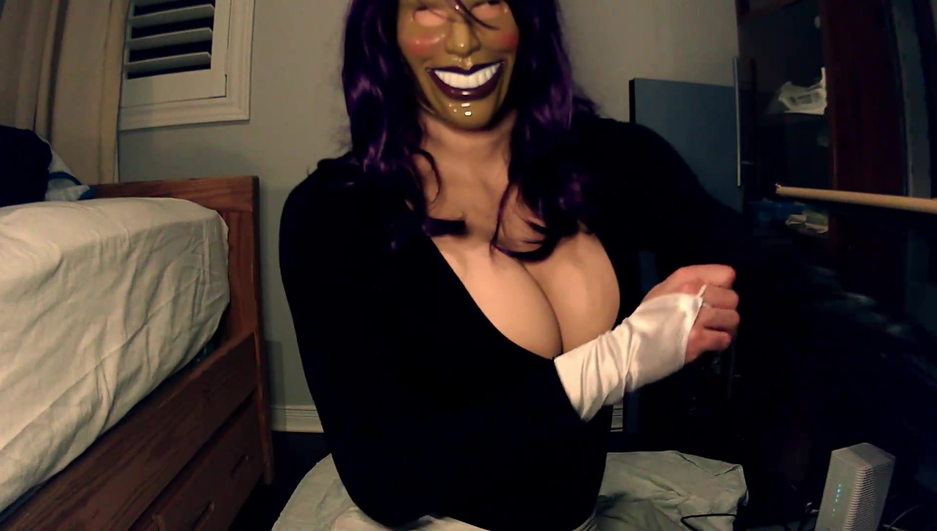 Purple Sheli Pt2! Dual hooded female puts on her leather mittens and plays with her enormous protection hooters!
