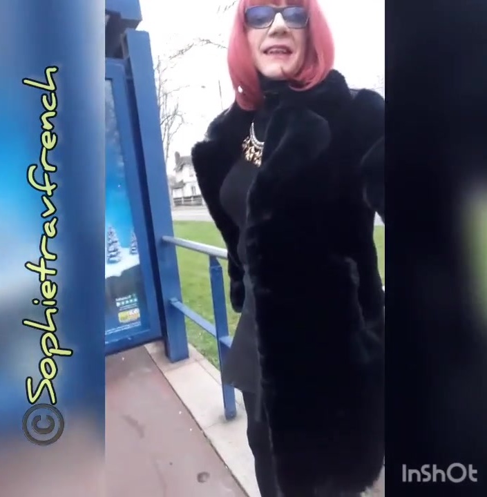 Exhibitionist slut displaying in a wool coat by a engaged road