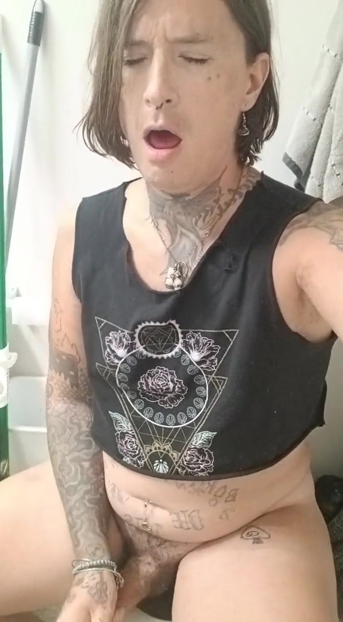 Video of me alone in my bathroom. My partners not here so a girls gotta do what a girls gotta do. Join me as I jerk off, taste my precum and almost split my self in half with huge dildo. Then at the end I have an A+ finish