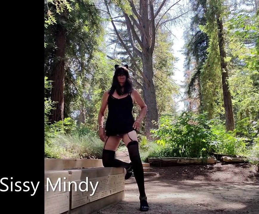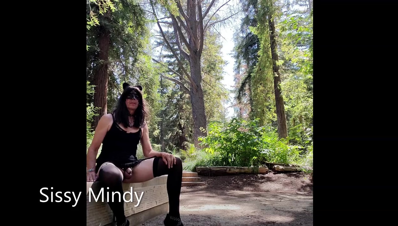 Locked in chastity and wearing a tiny short mini dress, Sissy Mindy takes photos on the trail in the park. lots of people around checking her out.