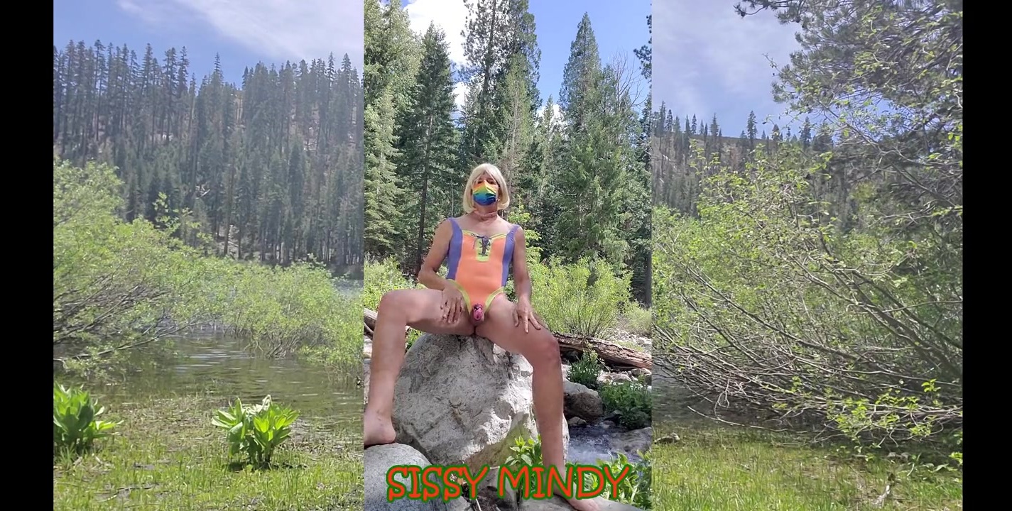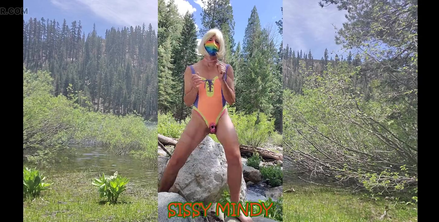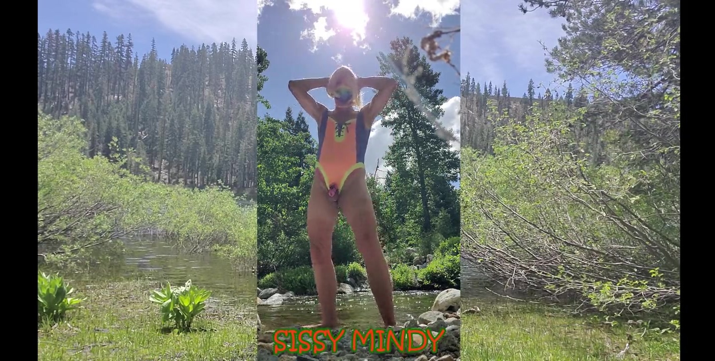 Sissy Mindy is dancing for you on the riverbank showing off her special swimsuit that exposes her little pink chastity cage.