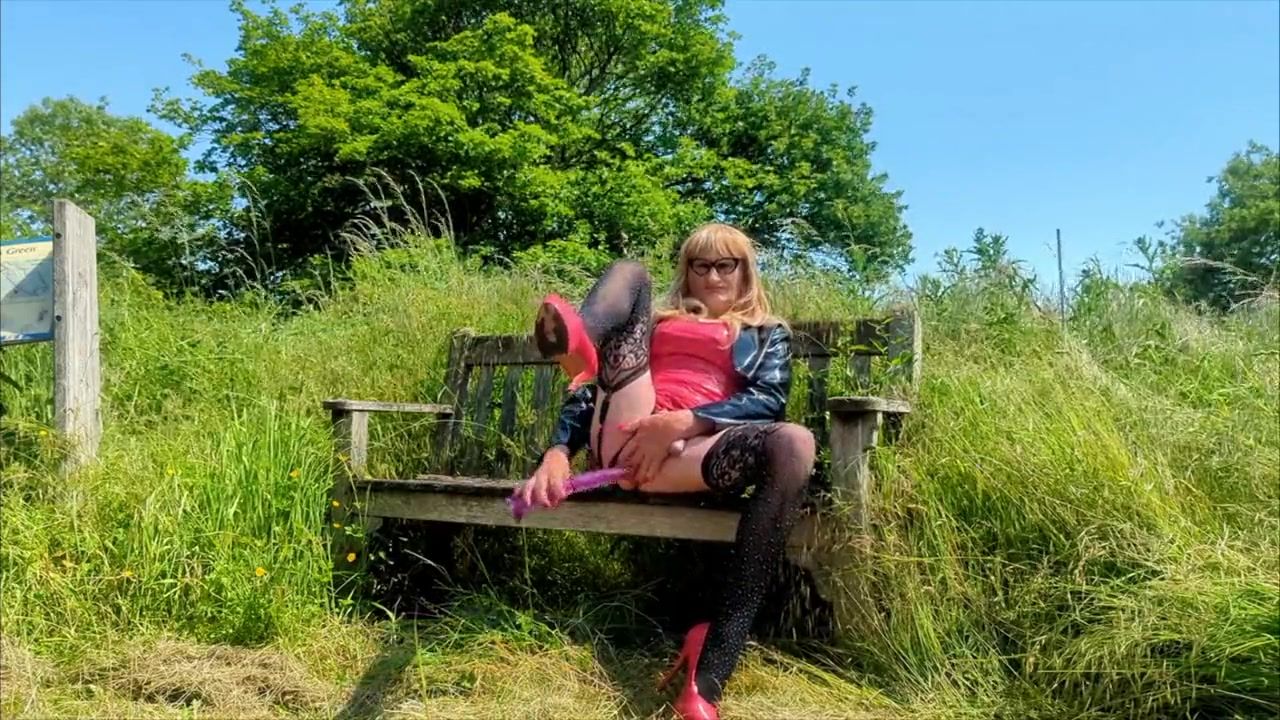 Tranny Gina outdoors in pvc fucking her ass with dildo