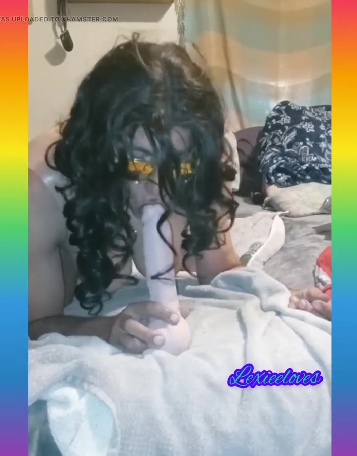 Lexiee is a dildo slut fucking this nine inch dildo to the balls then deep throats it all now this made her want cum so she places her cock above her and shoots a load in her own mouth