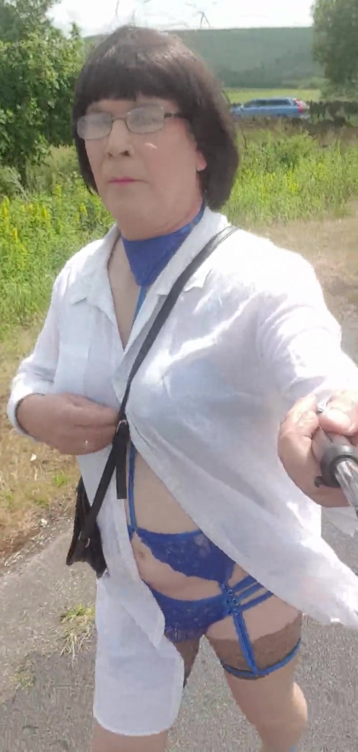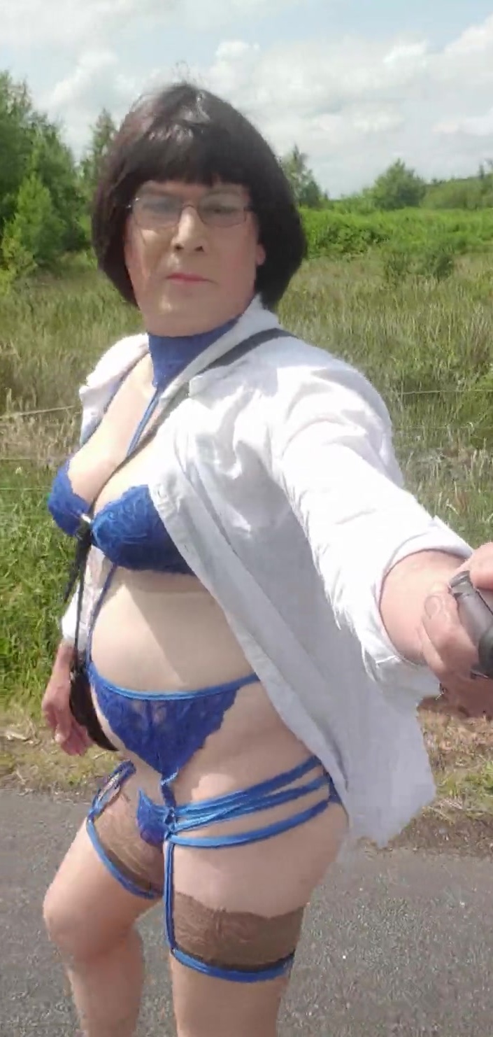 Walking crossdressed on a public lane caged and plugged in blue lingerie and heels