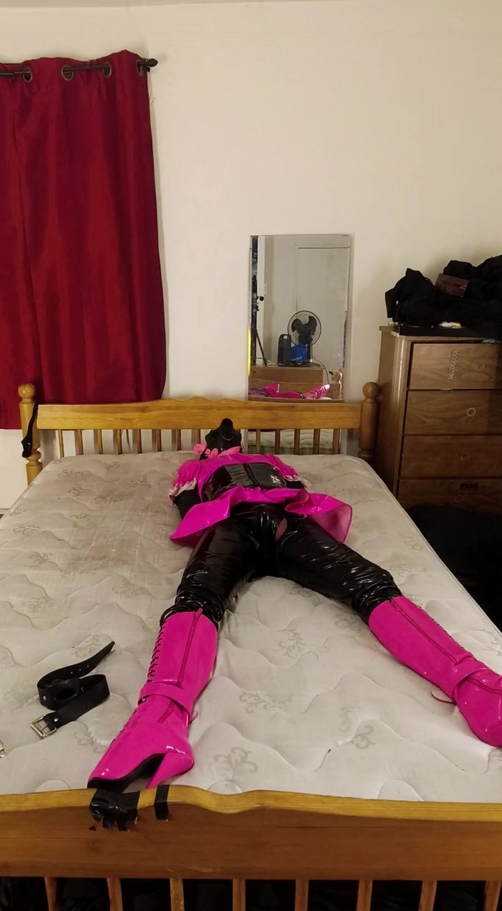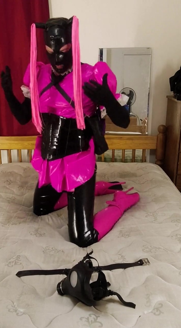Sissy Maid Self Restrain Bondage Gas Mask Armbinder in Purity and Ballet Footwear