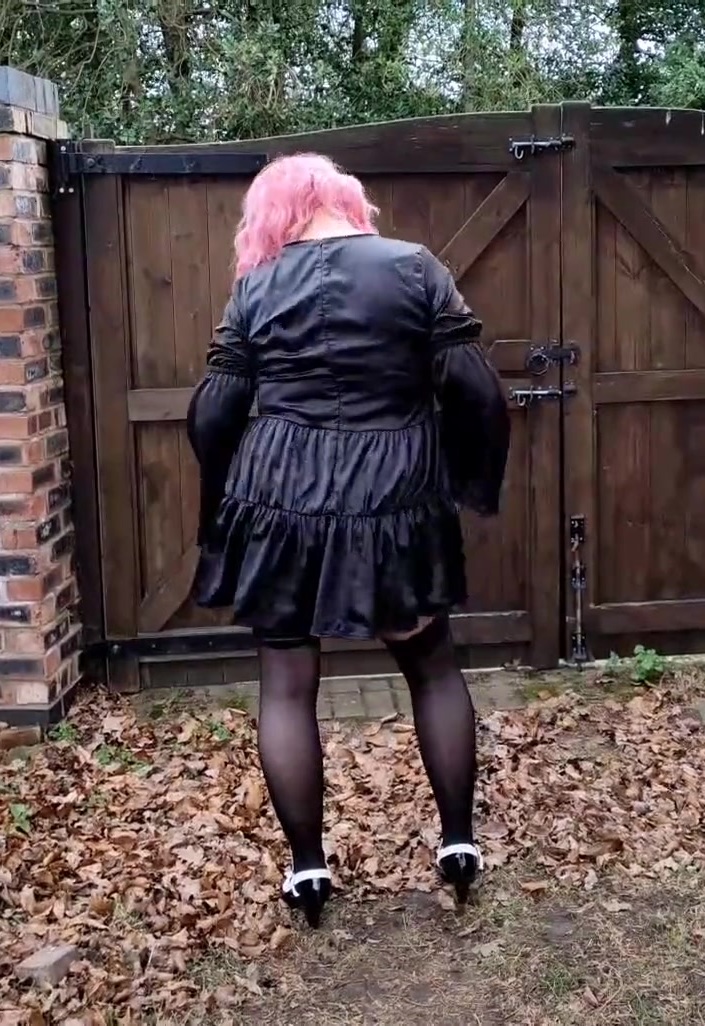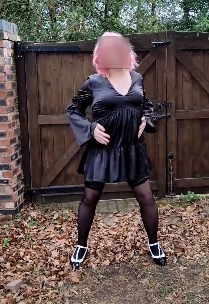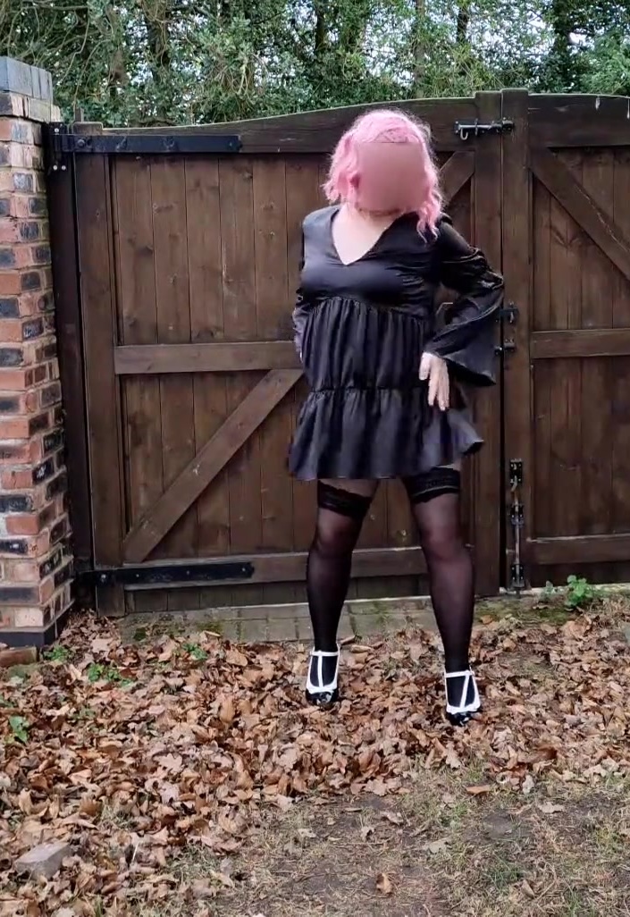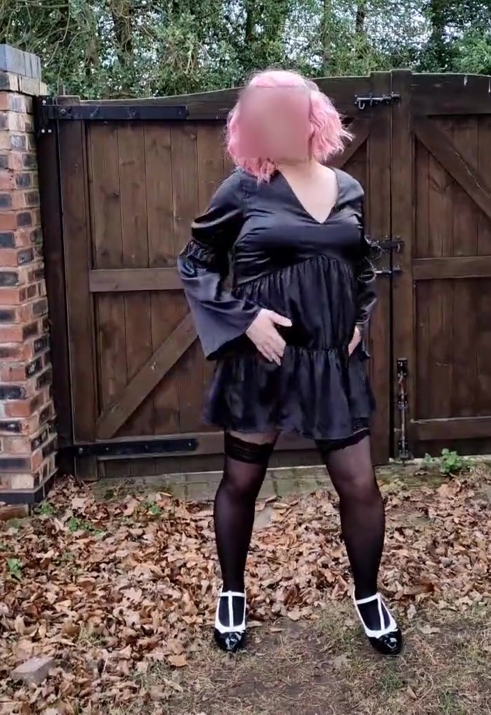 Hot TV crossdresser Nottstvslut in sexy black satin dress and stockings