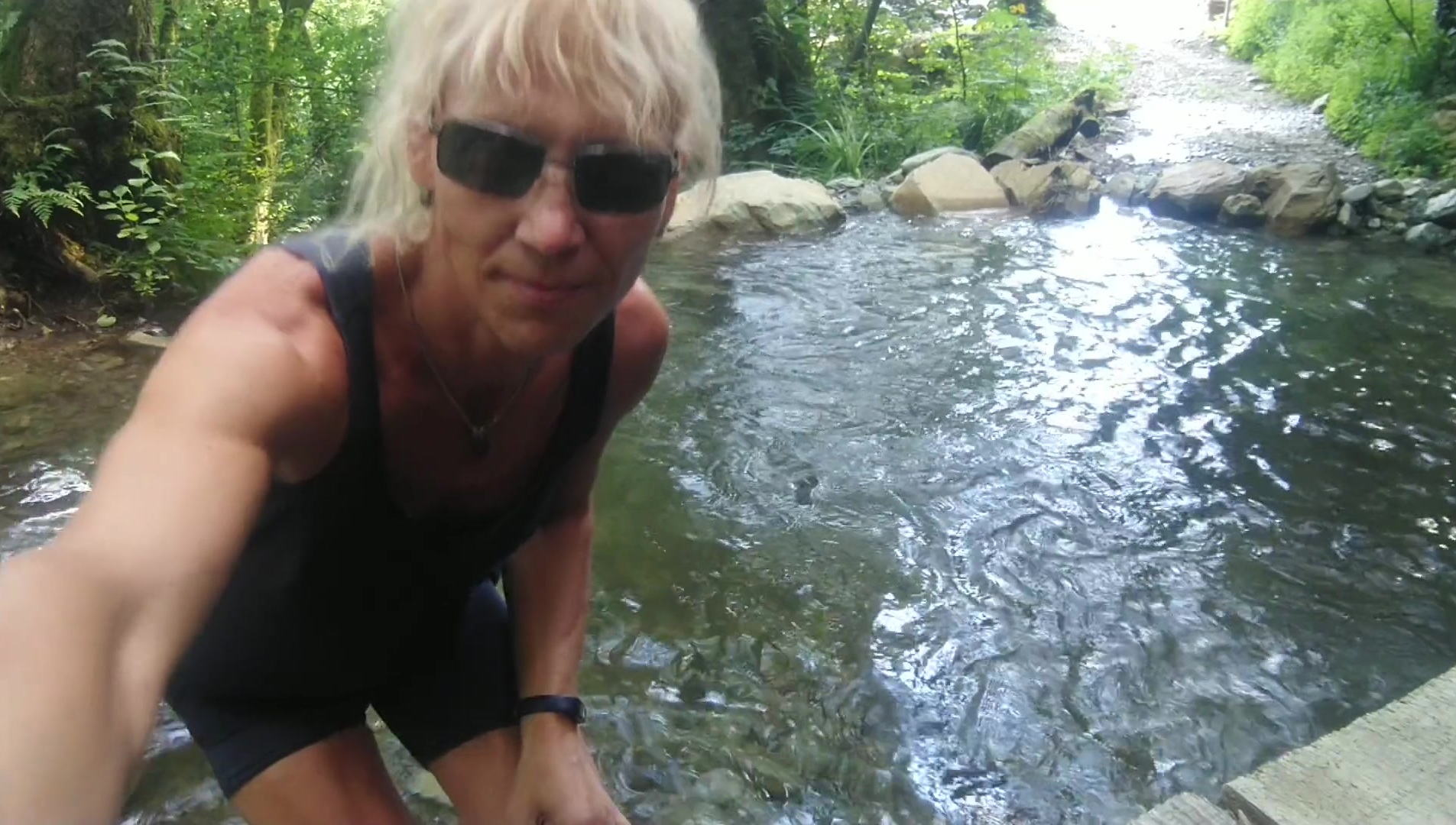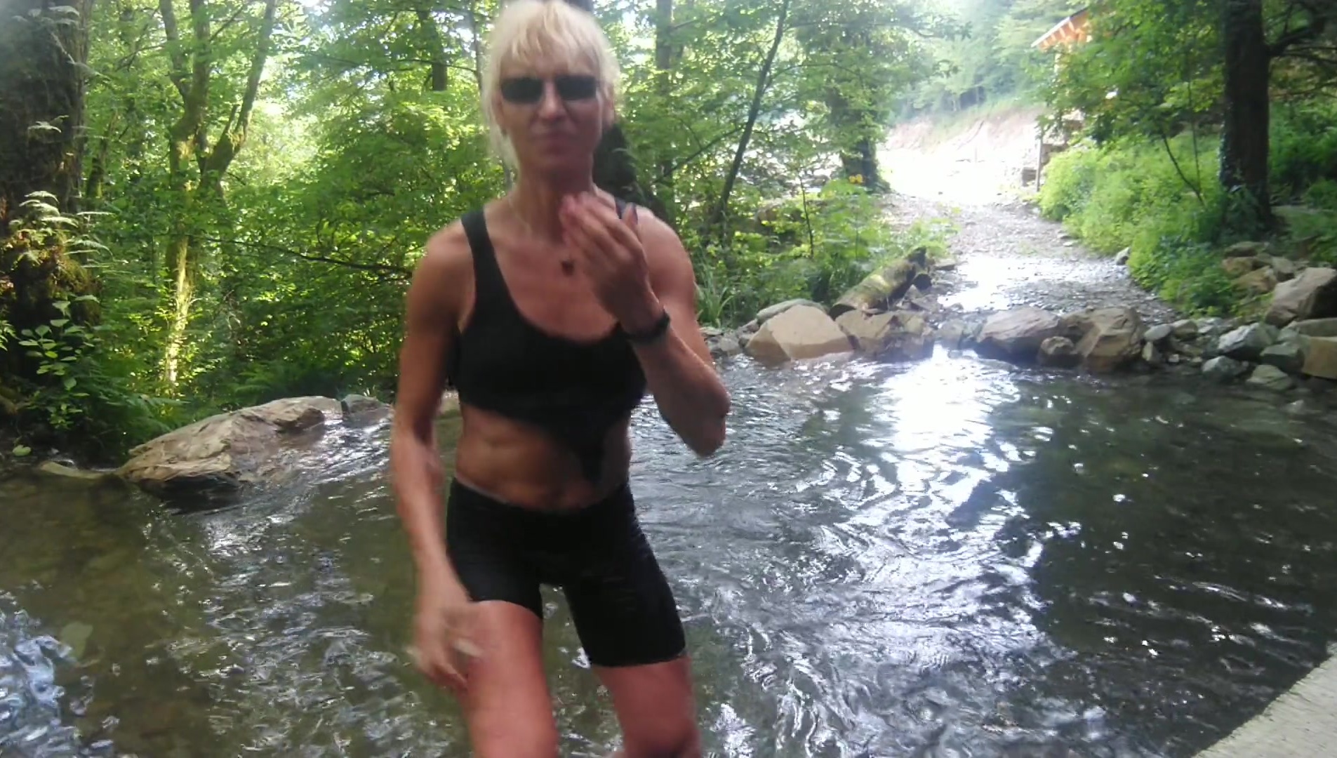 Alexa Cosmic trans doll swimming in font near waterfall dressed in cut-offs and t-tee-shirt...