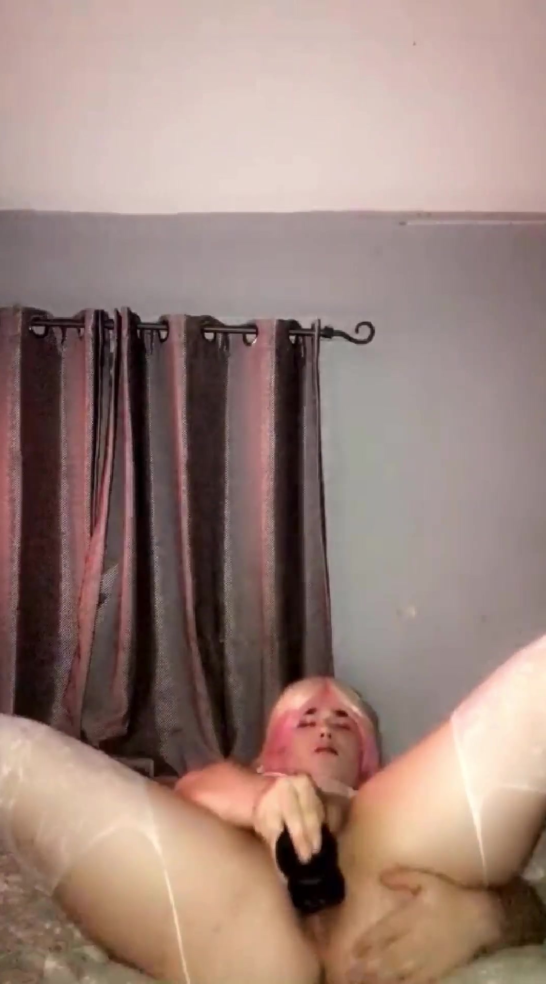 Sissy mega-slut clothed up on her back using black faux-cock