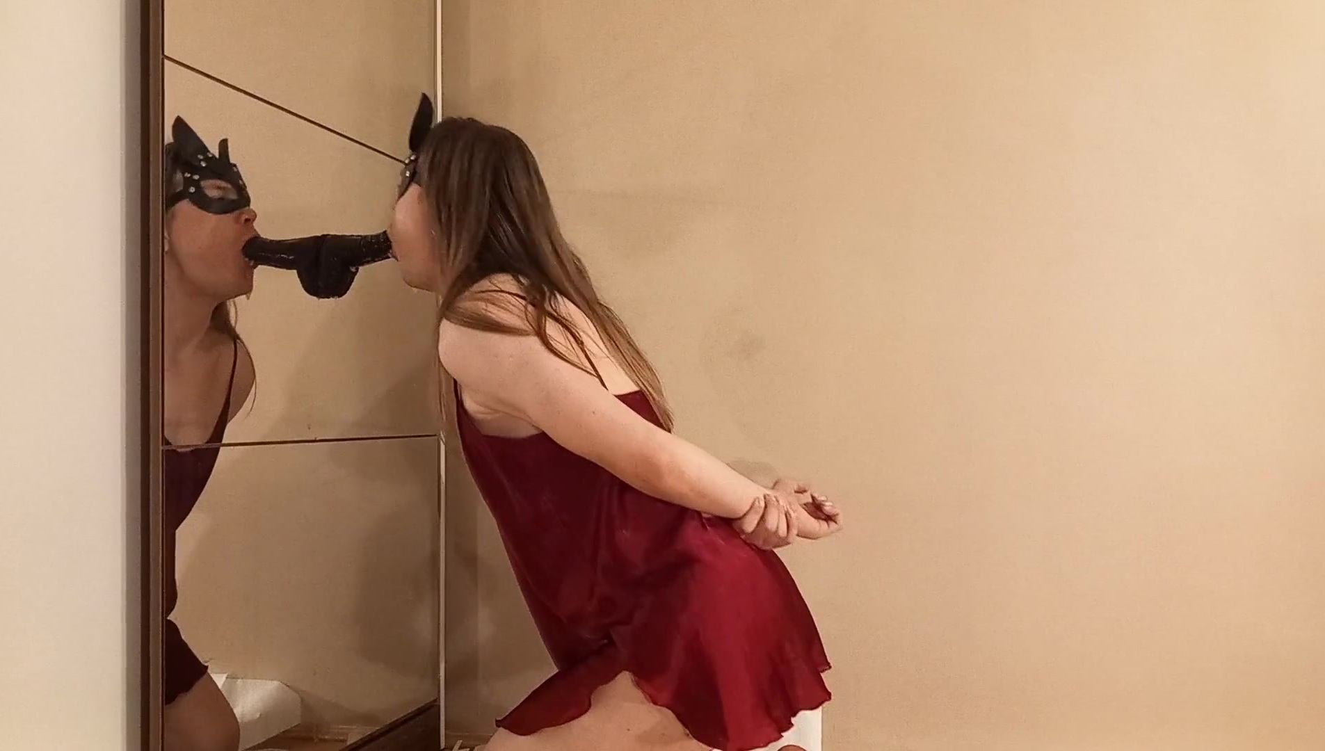 Sissy in a red nightie working cock in front of the mirror. On her knees she sucks it, lubing it up for the real fun. Slobbering all over the cock she gags and gives it as sloppy deepthroat with her hands behind.