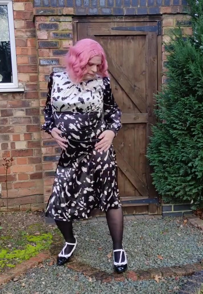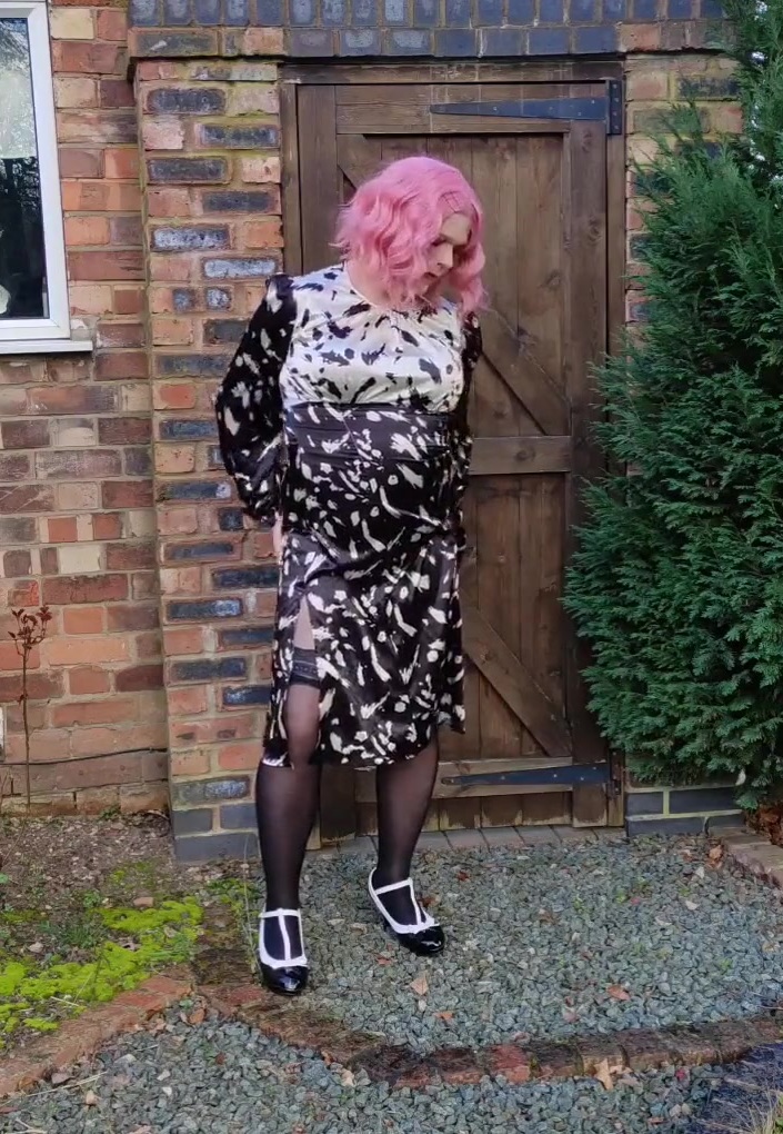 Pink haired UK TV crossdresser Nottstvslut in sexy black satin dress outdoors