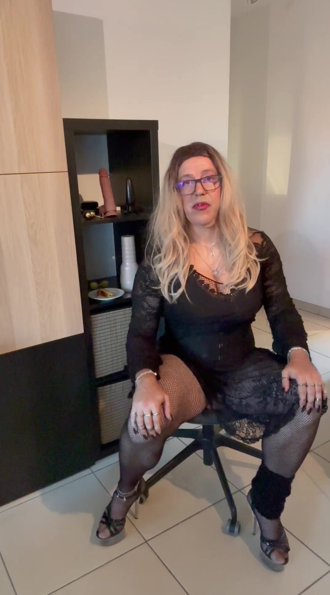 In fishnet and lace platform heel outfit with two nice cumshots.