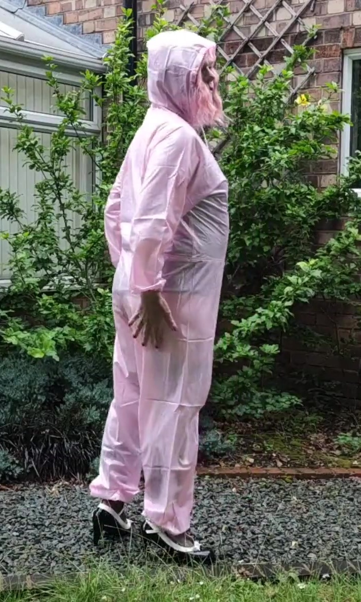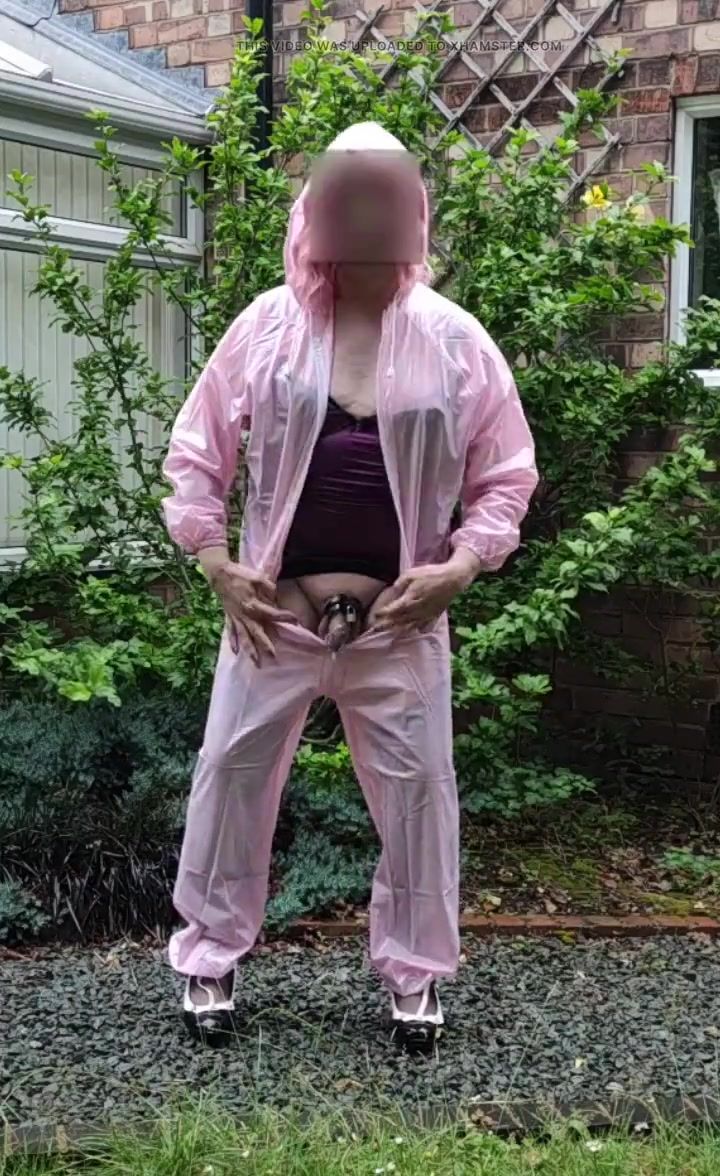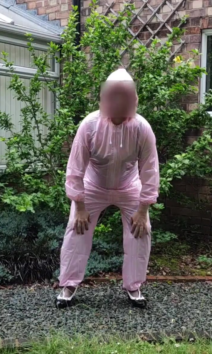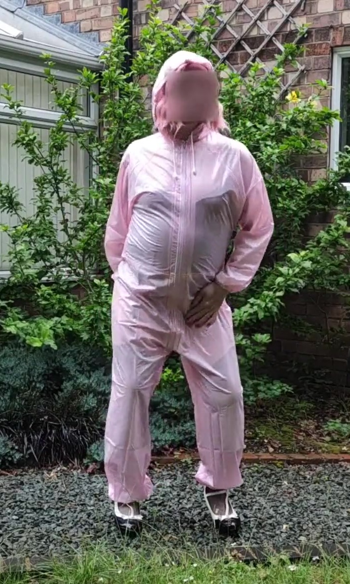 Crossdressing TV slut Nottstvslut outdoors in transparent pink PVC boilersuit