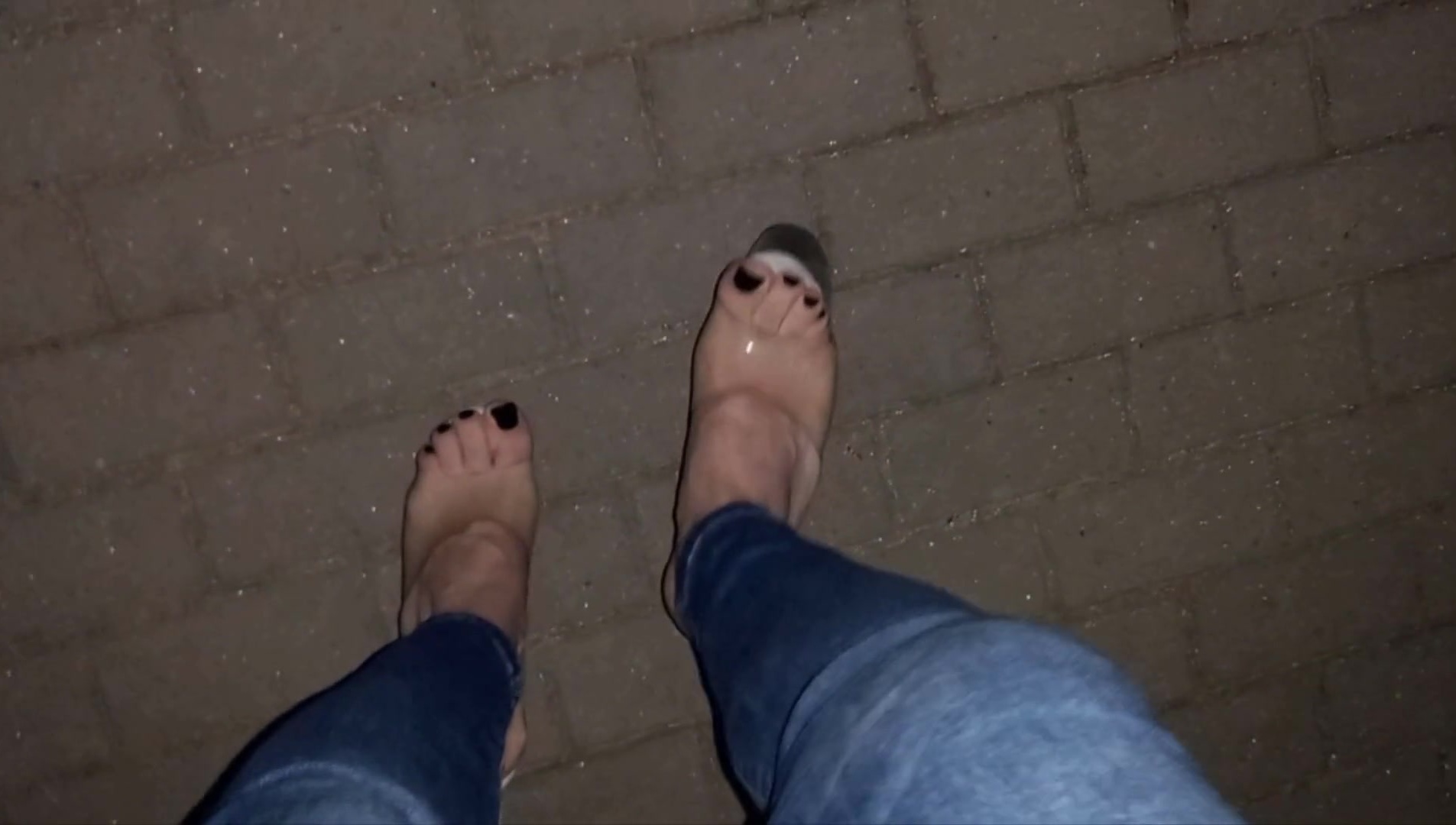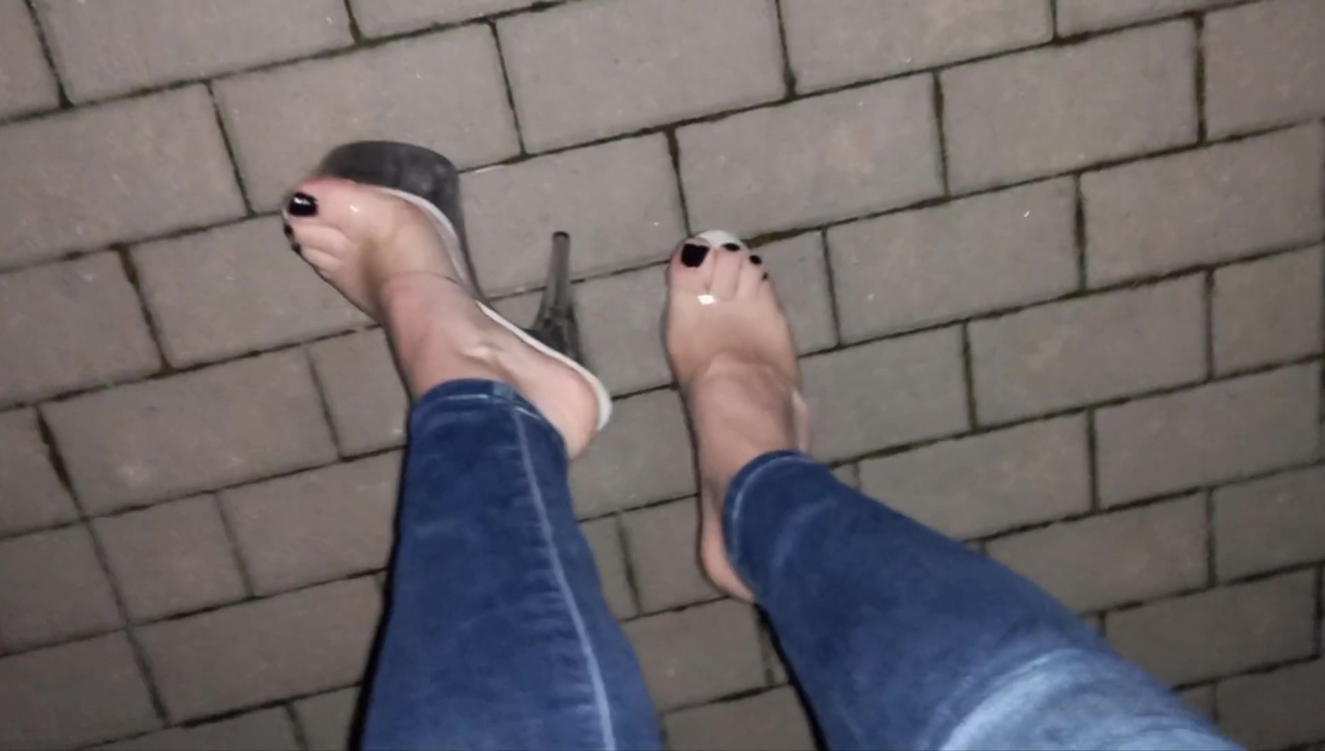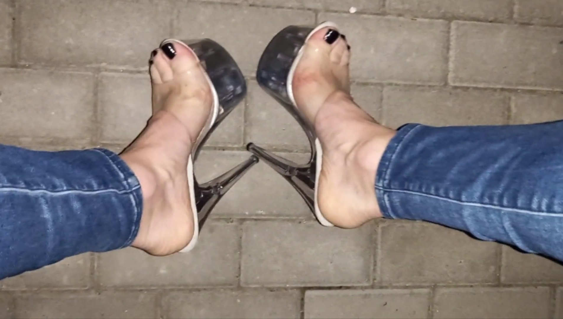 crossdresser entices with her uber-sexy soles in stripper footwear on the street