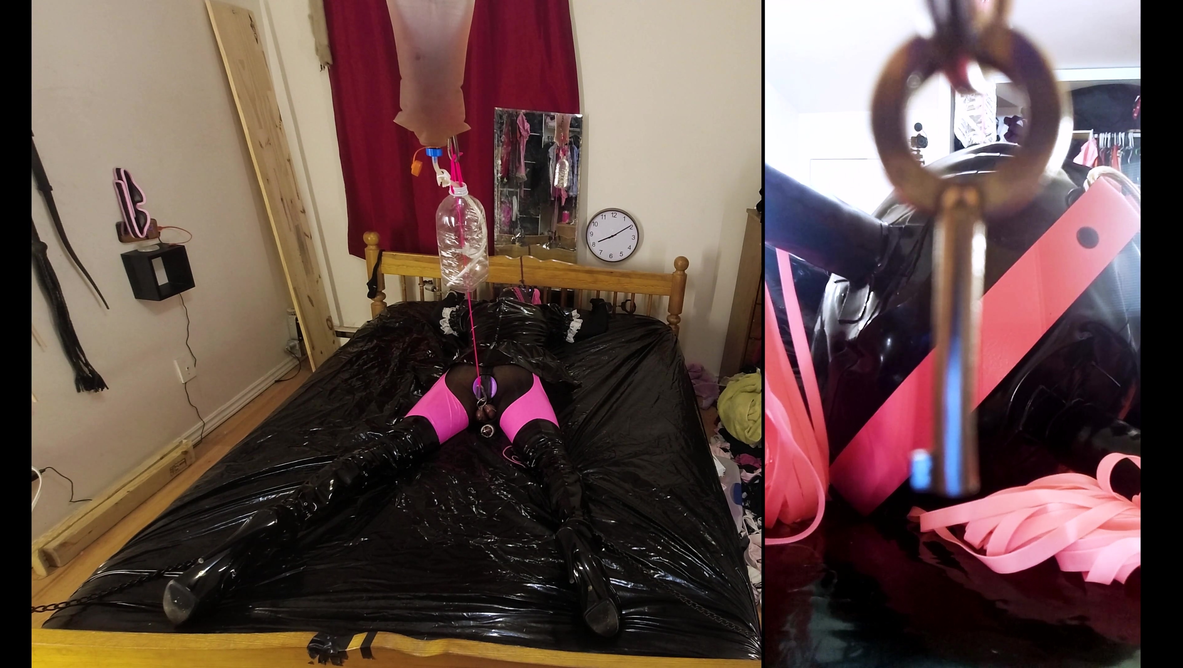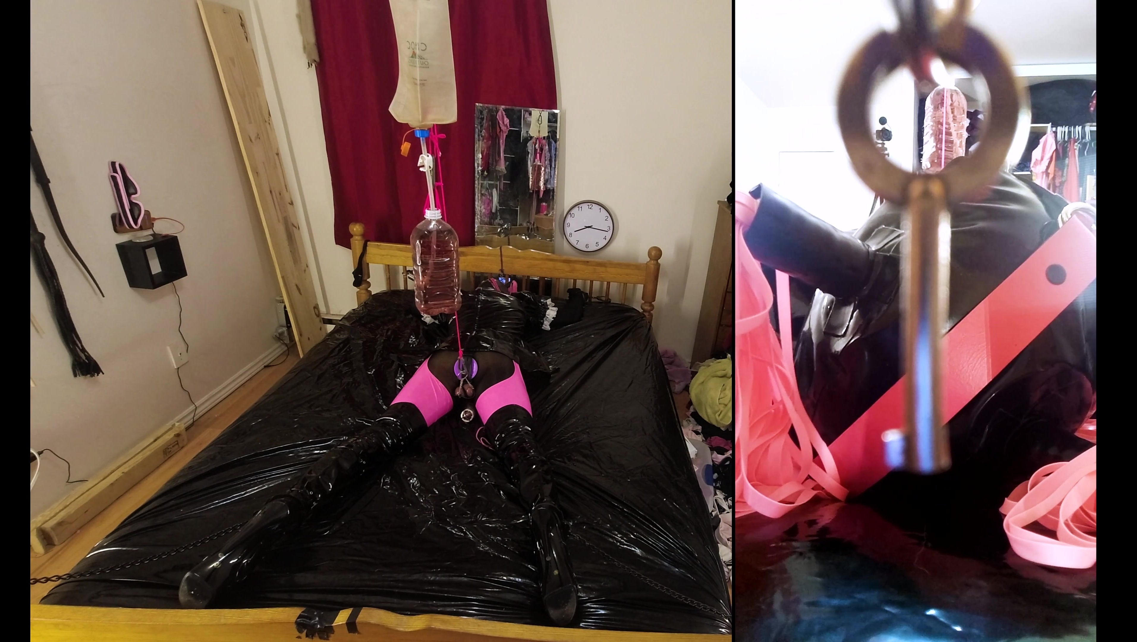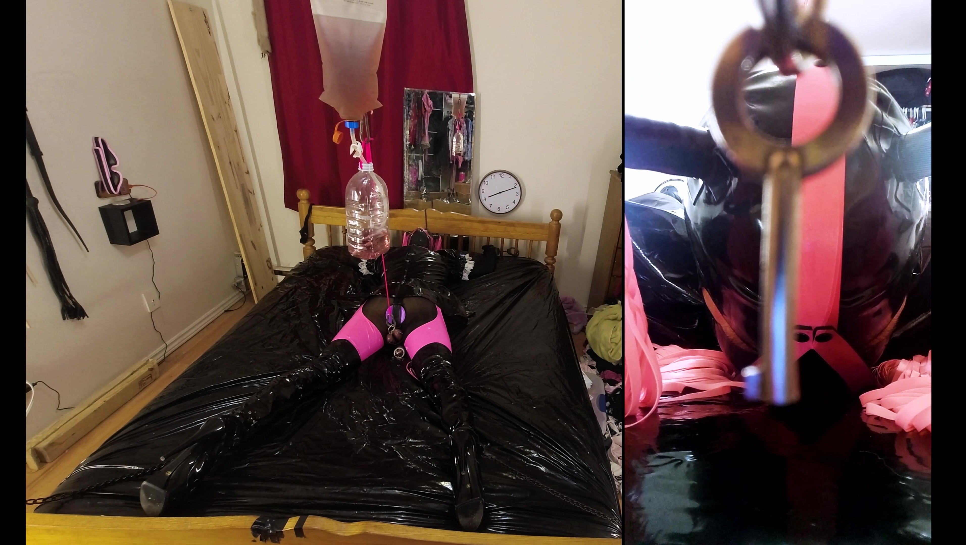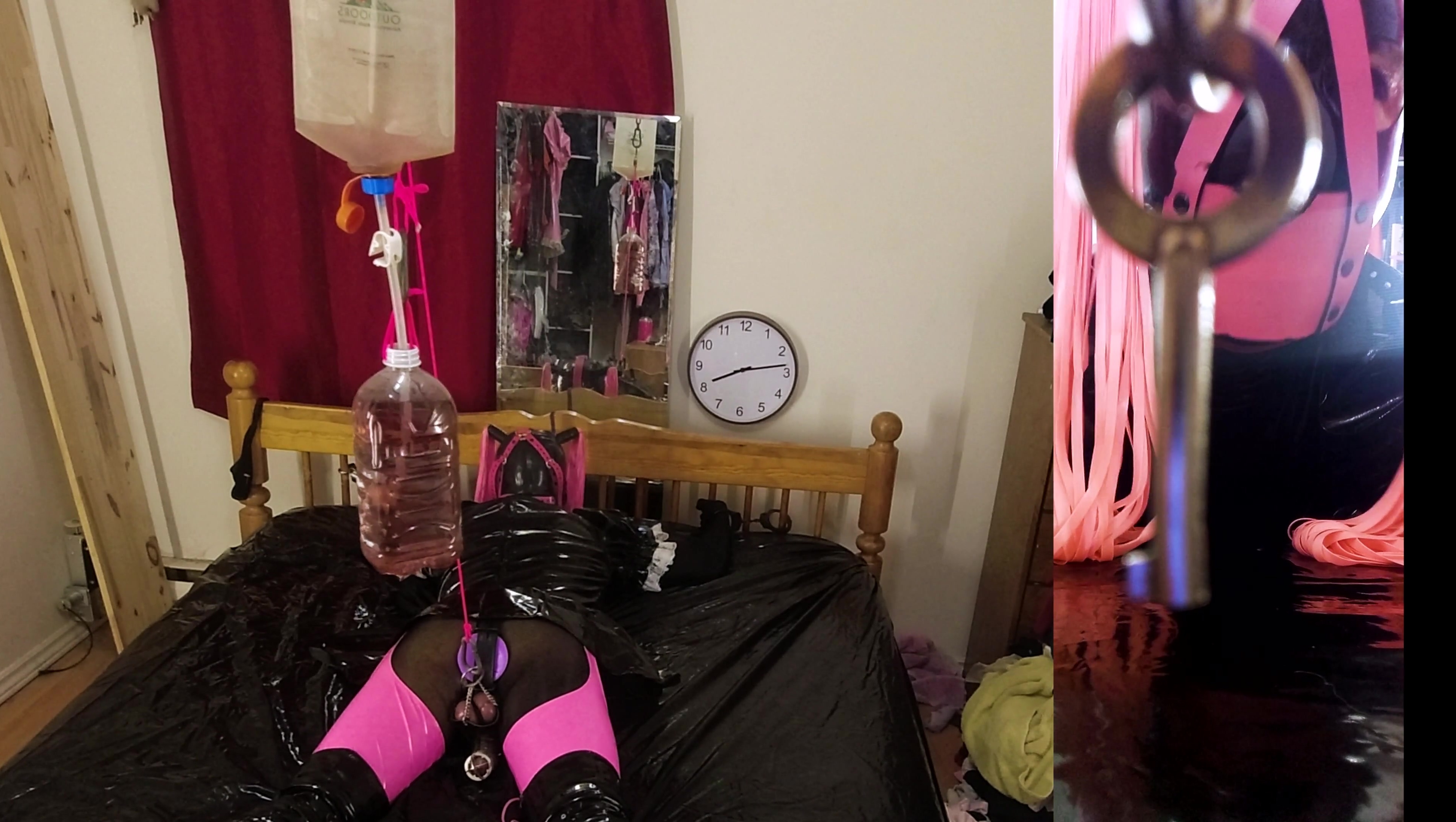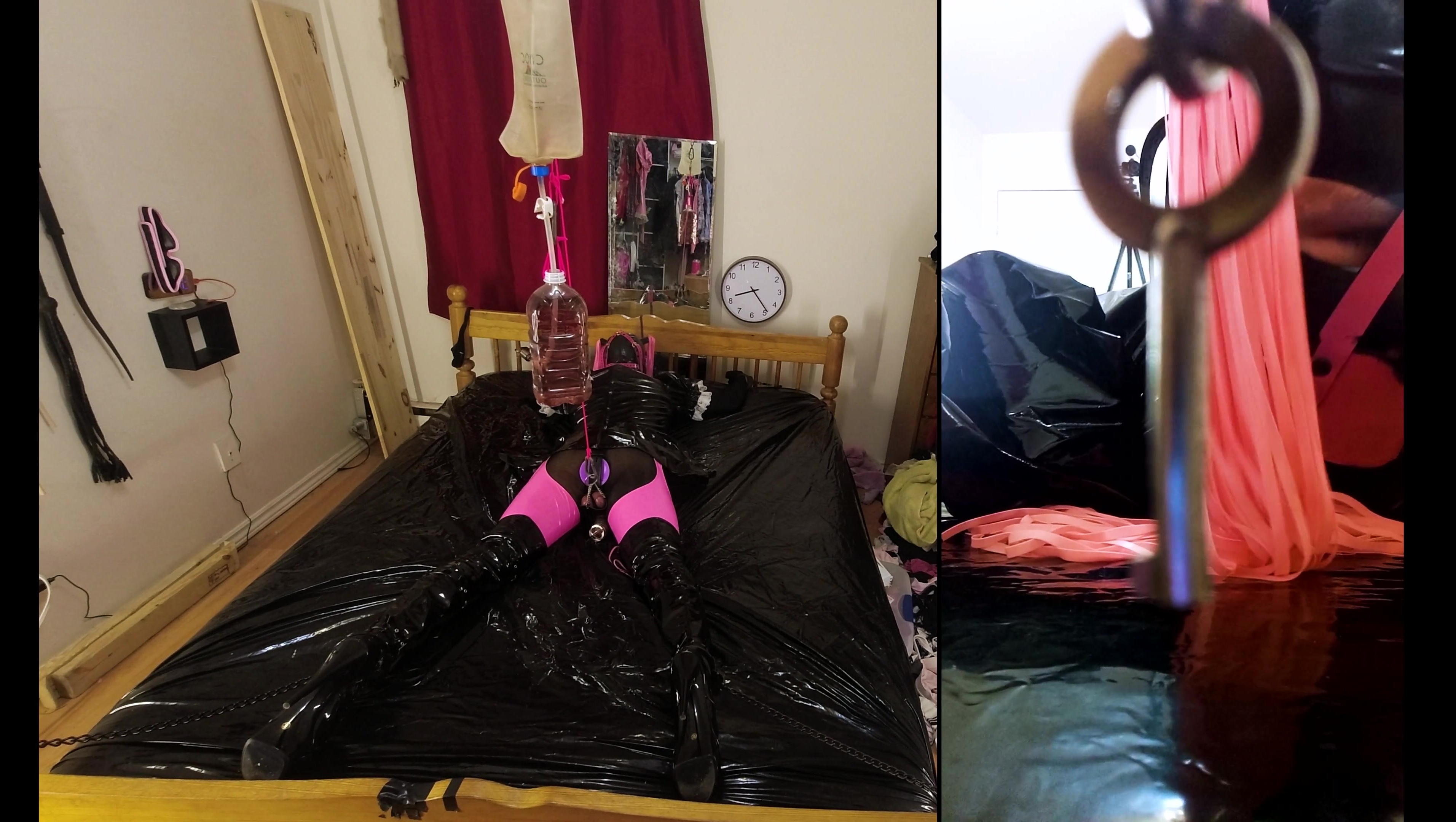 water filling the jug tied to sissy maids balls, 2 liters of water tugging on balls with cock locked in a spiked chastity cage...handcuffed spread eagle on the pvc sheet waiting for the ice to melt hold one of the cuff to the bed.... in the middle hangs a key to the handcuffs just out of reach of the poor maid.. with a large purple dildo locked deep inside....muzzle gag strapped on tight holding in cum soaked panties to silence the screams and moans as the spikes dug in deeper and the dildo slide in deeper..