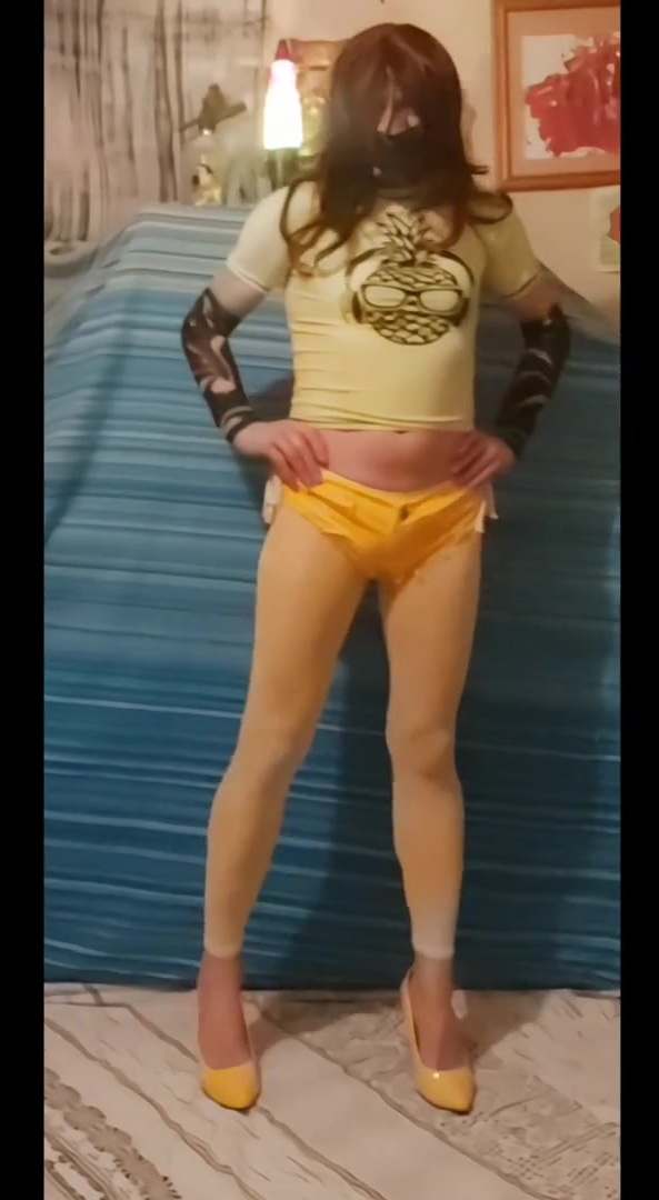 My favorite colour is yellow so I made a compilation in my yellow cutoffs yellow high-heeled slippers and pantyhose