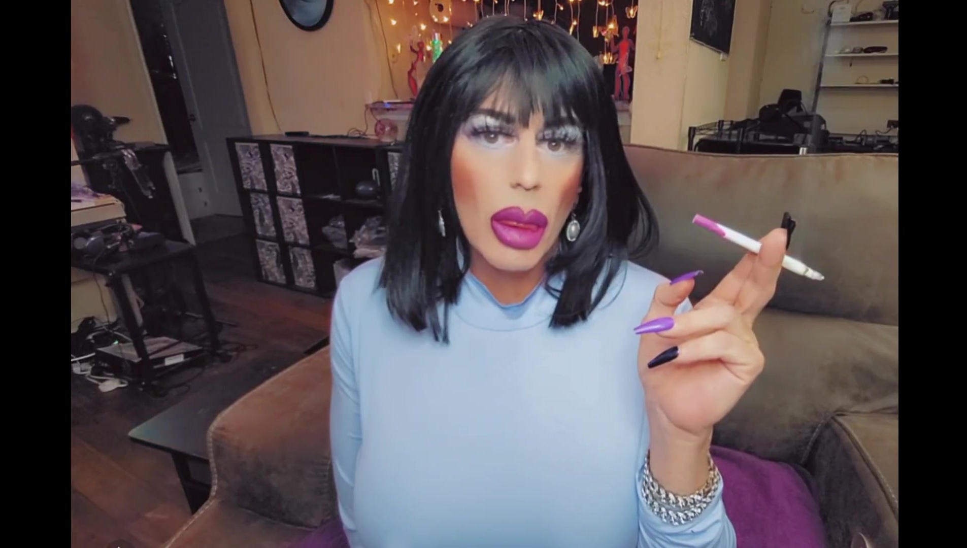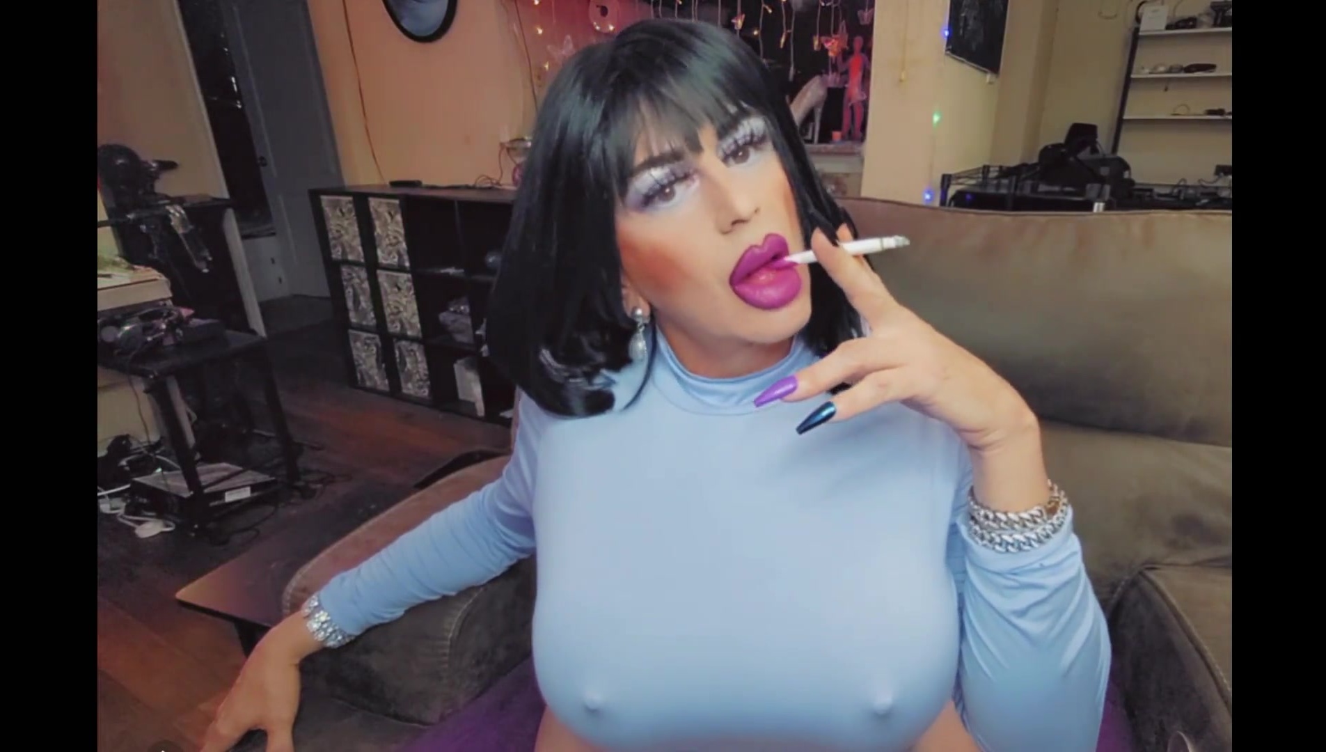 Glorious cherry crossdresser smoking with monstrous lips lip liner cross dressing trans strong make-up