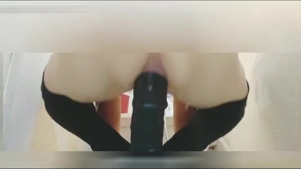 Sissy in stilettos plays with gigantic black fucktoy dressed in virginity cell
