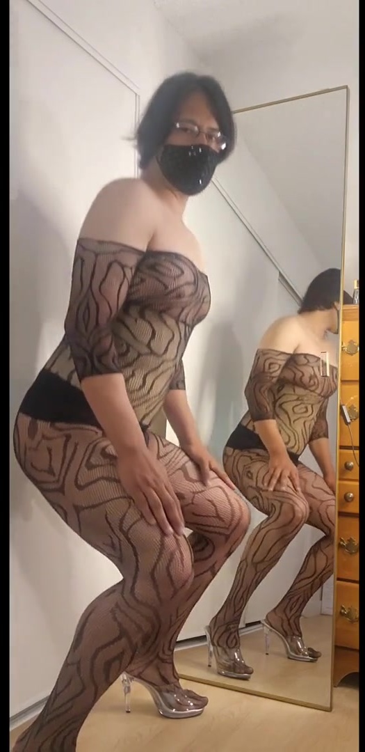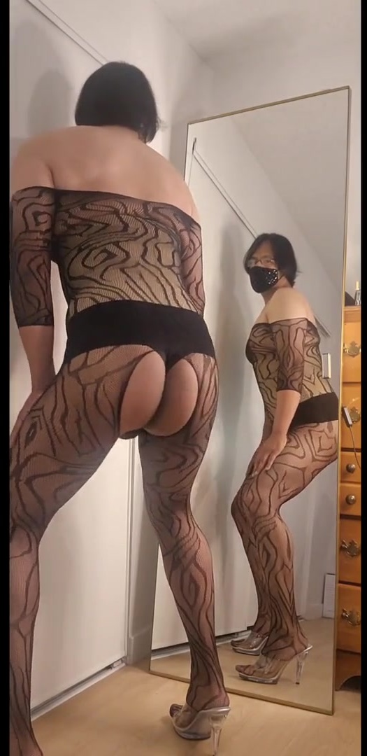 Fabulous femboy in bodystocking and high-heeled shoes makes use of his three set f...