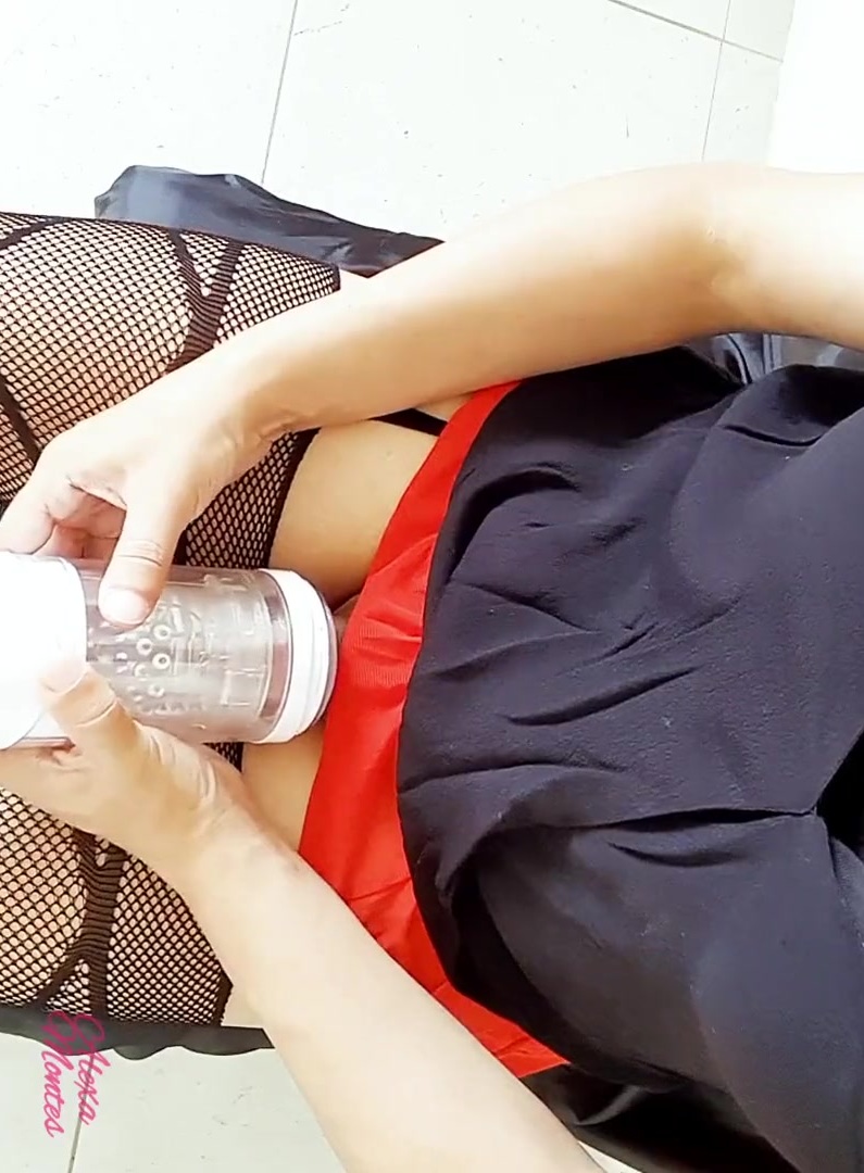 Trans plays with a masturbator and jizm
