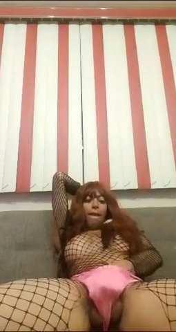 Red-Haired transgirl in ebony underwear wanks w high high-heeled shoes on