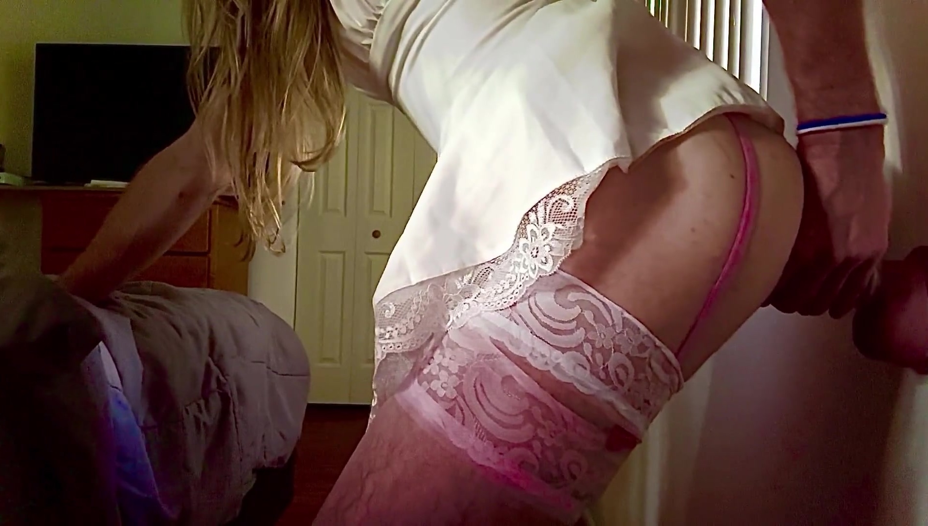 White lace, black faux-cock. CD in underwear penetrates ample black faux-cock. Goo...