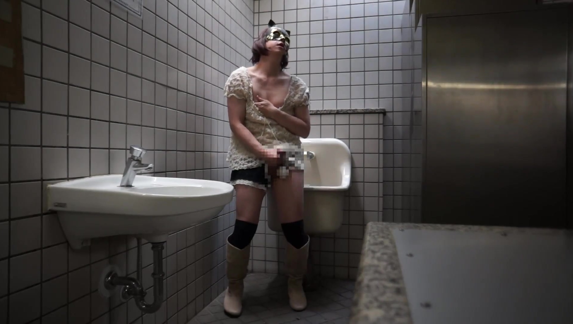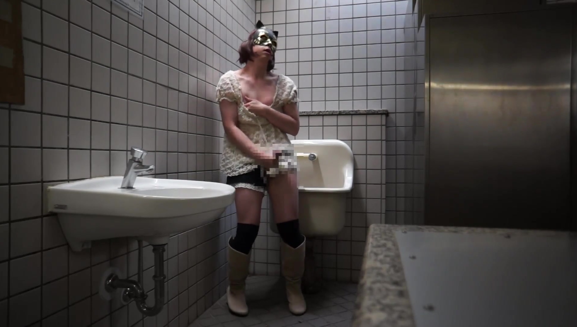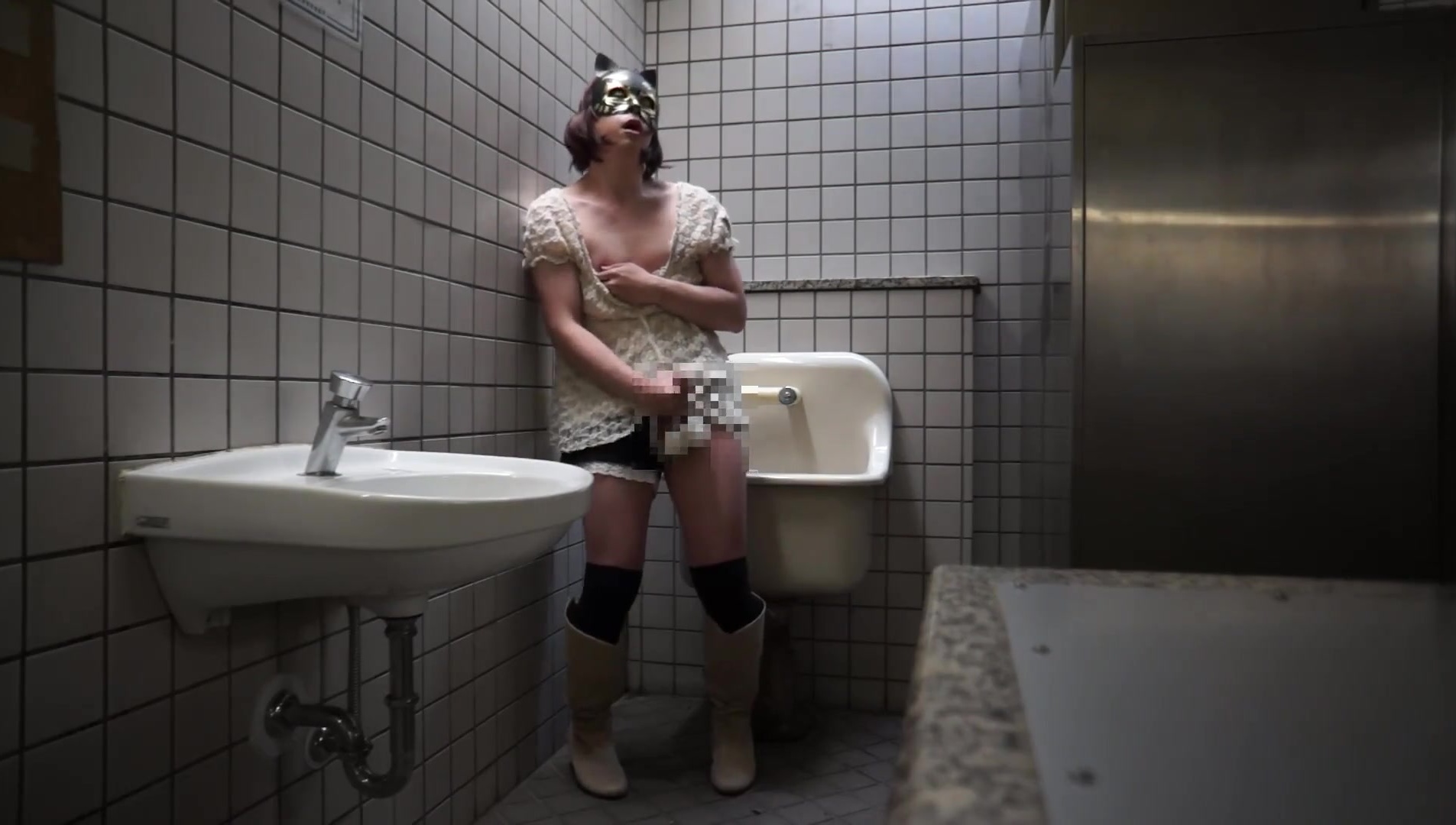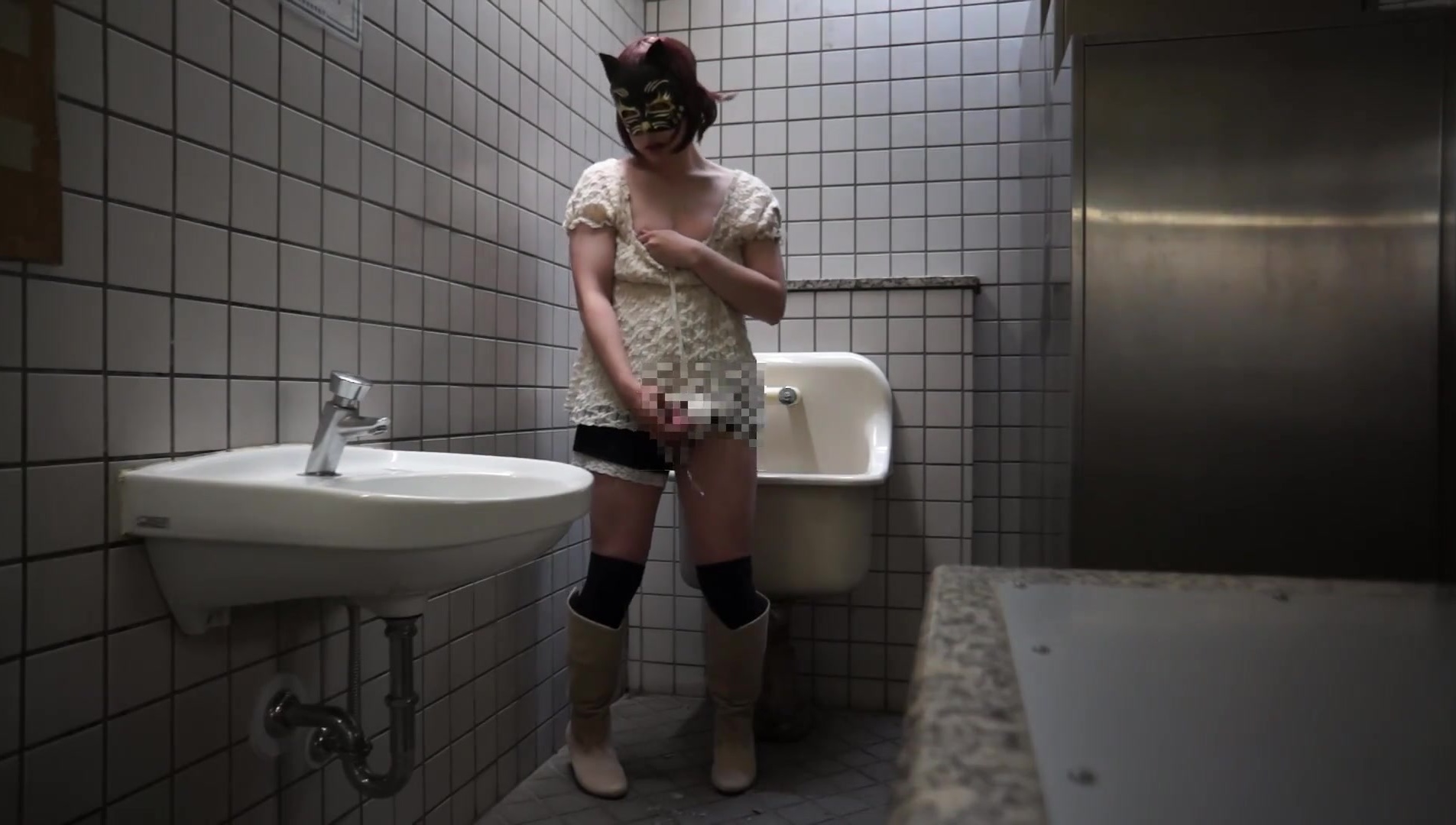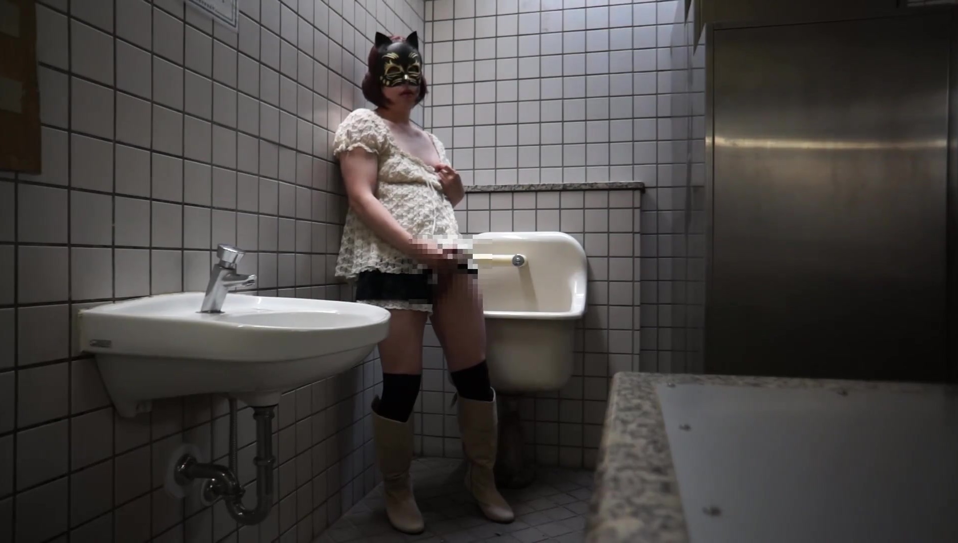 Asian femboy who cosplays as a assistant is doing pervy onanism in a public rest room