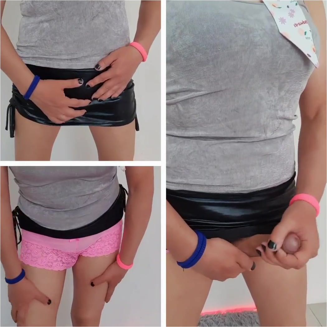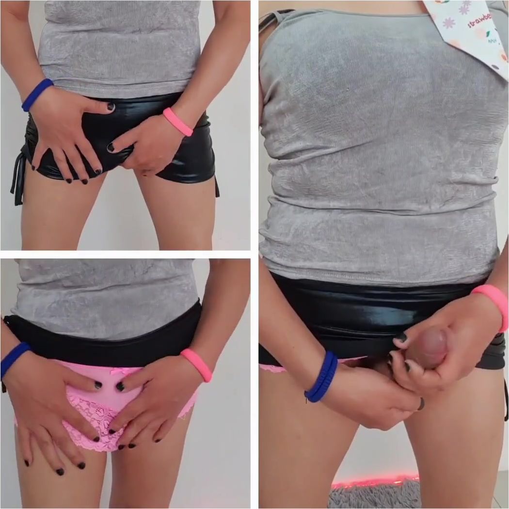 Buxom transgender princess in lace underpants jacks off her smooth-shaven schlong ...