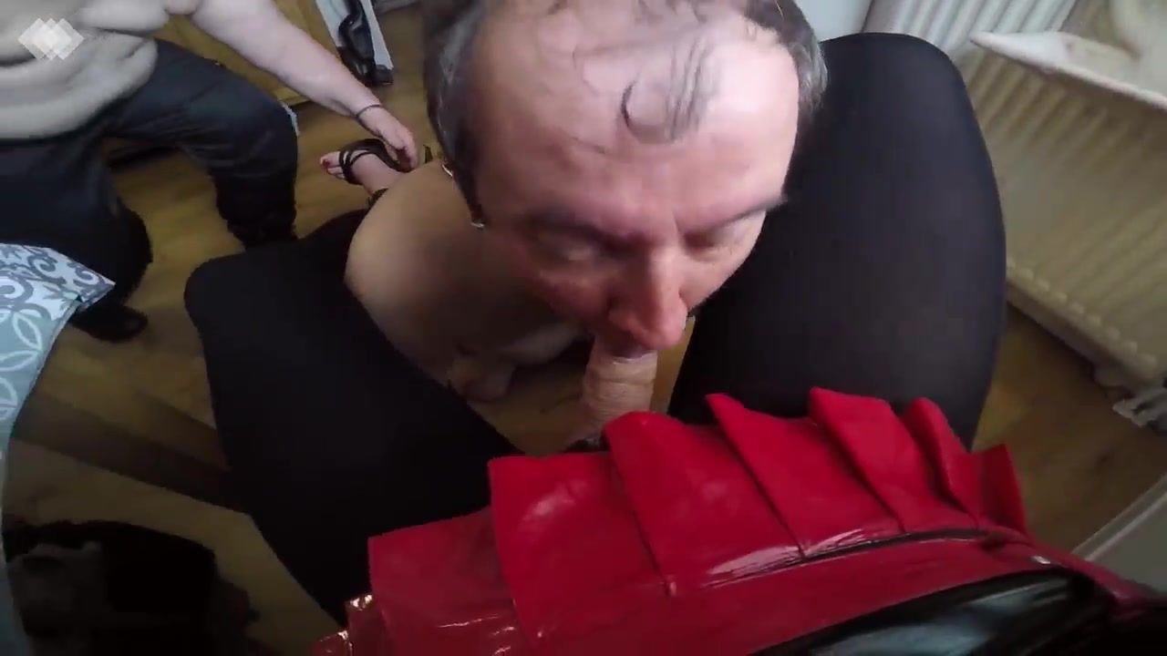 Two kinky guys with a mature amateur shemale, sucking her cock and licking her feet.
