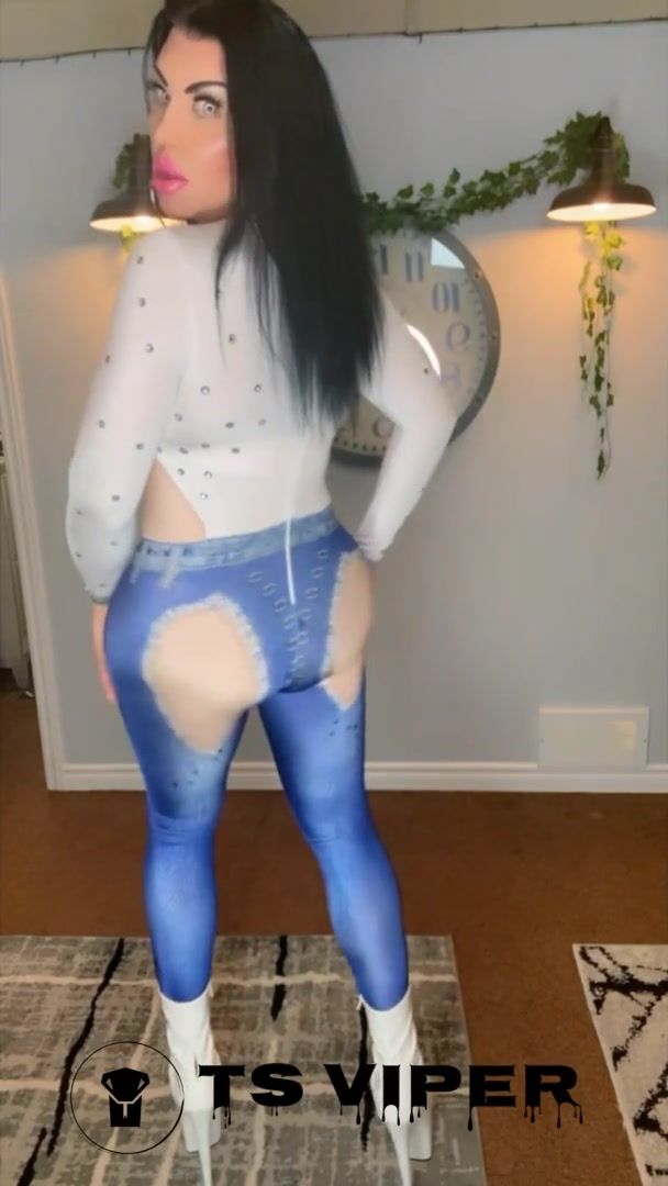TRANSSEXUAL VIPER WICKY BONDAGE SUIT LATEX DENIM LARGE KNOCKERS MEATY LIPS HUGE HIPS HIGH HEEL FETISH DITZY SMOKING 1