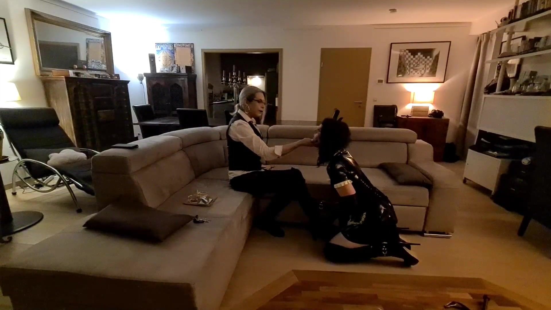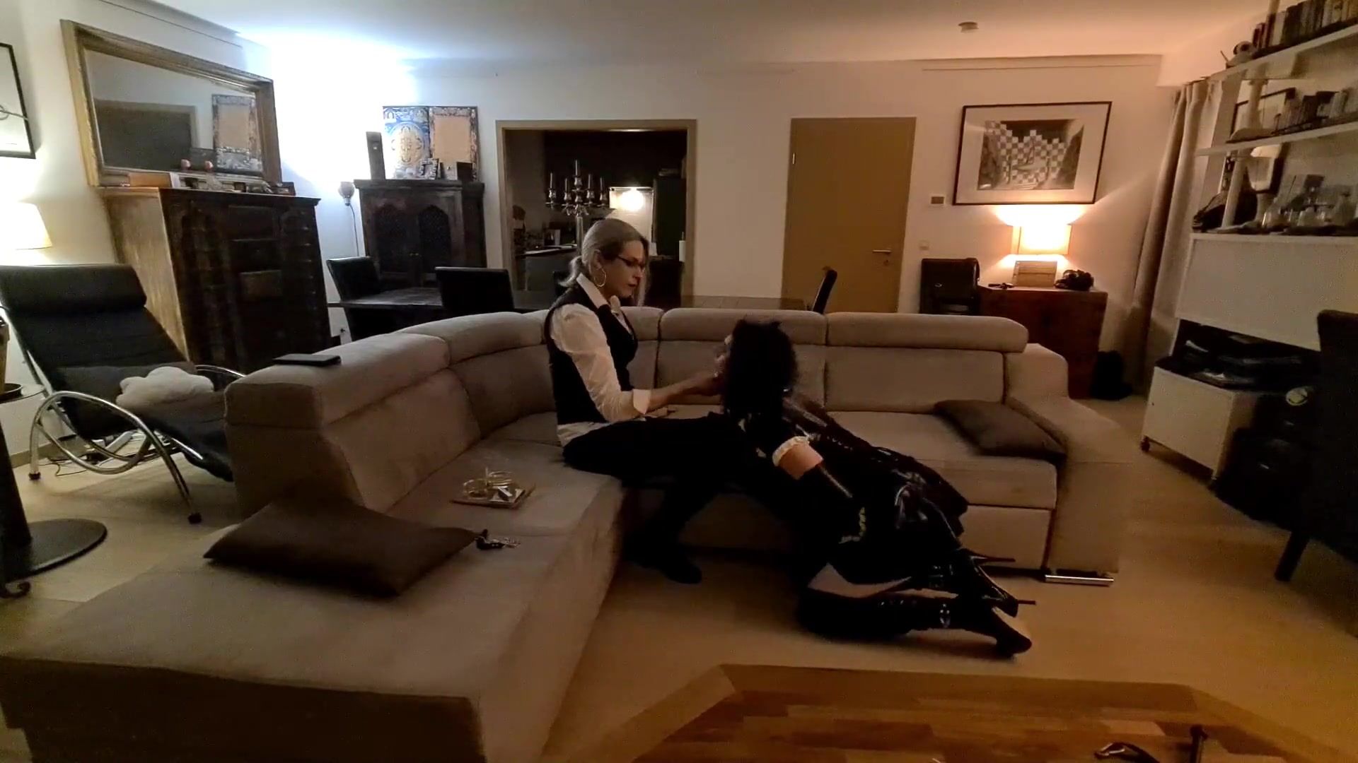 Spandex maid harshly treated by Dominatrix, munching her shoes and porked in virginity.