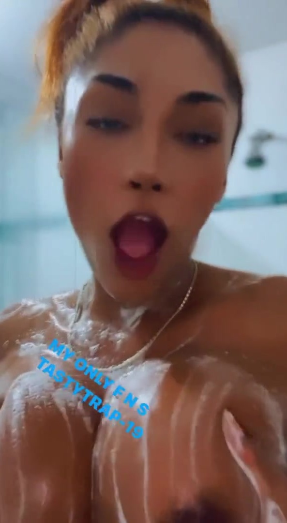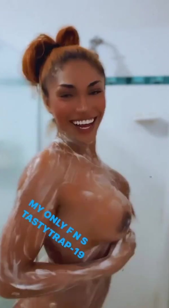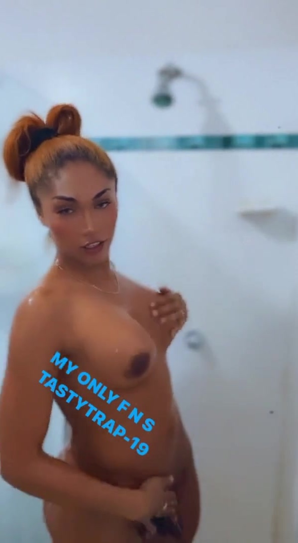 Moist trans nymph Sapphire Young plays with soap on her fat shemale bra-stuffers a...