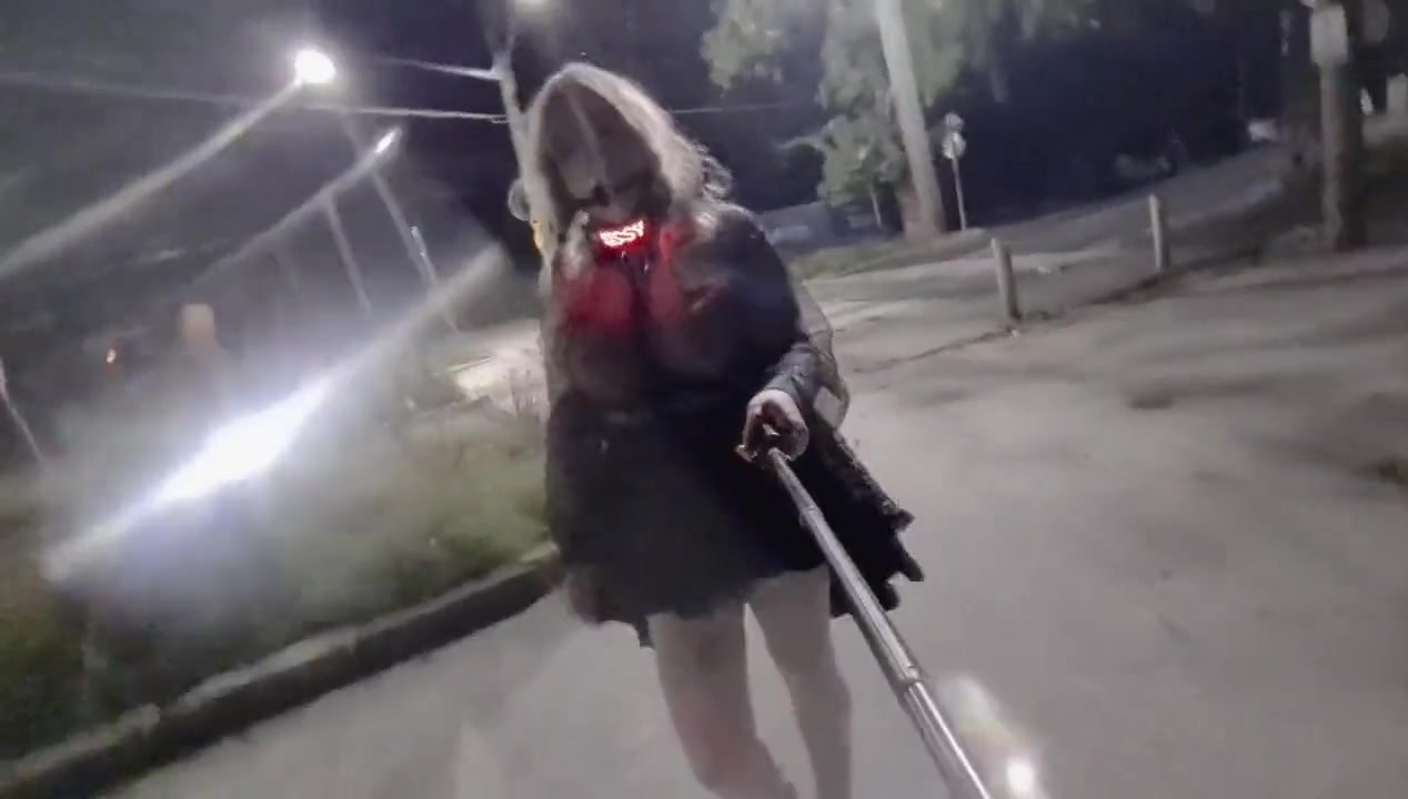 Mega-Bitch in translucent outfit ball gag and LED mutt dog collar caught in public