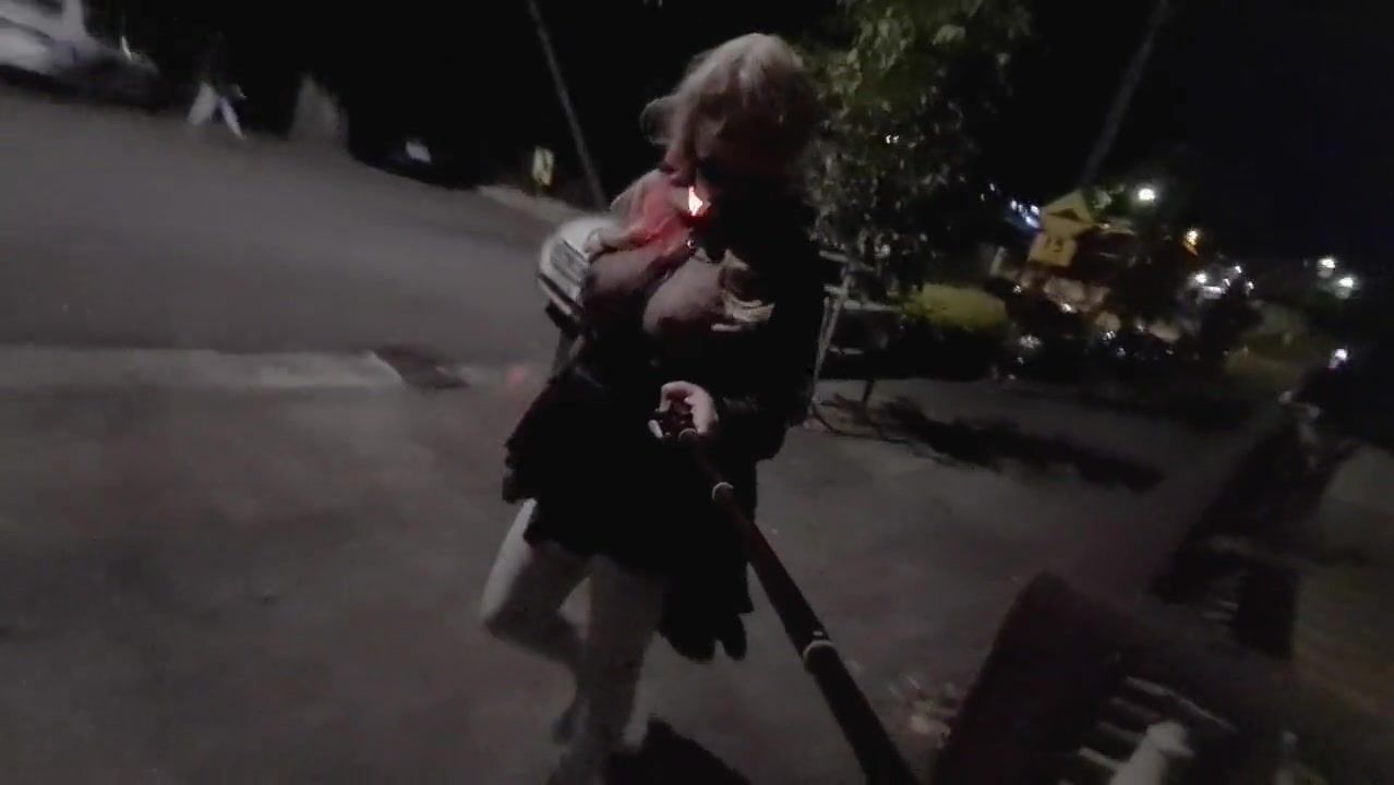 Dressed In see-through top and ball gag caught railing fake penis in public