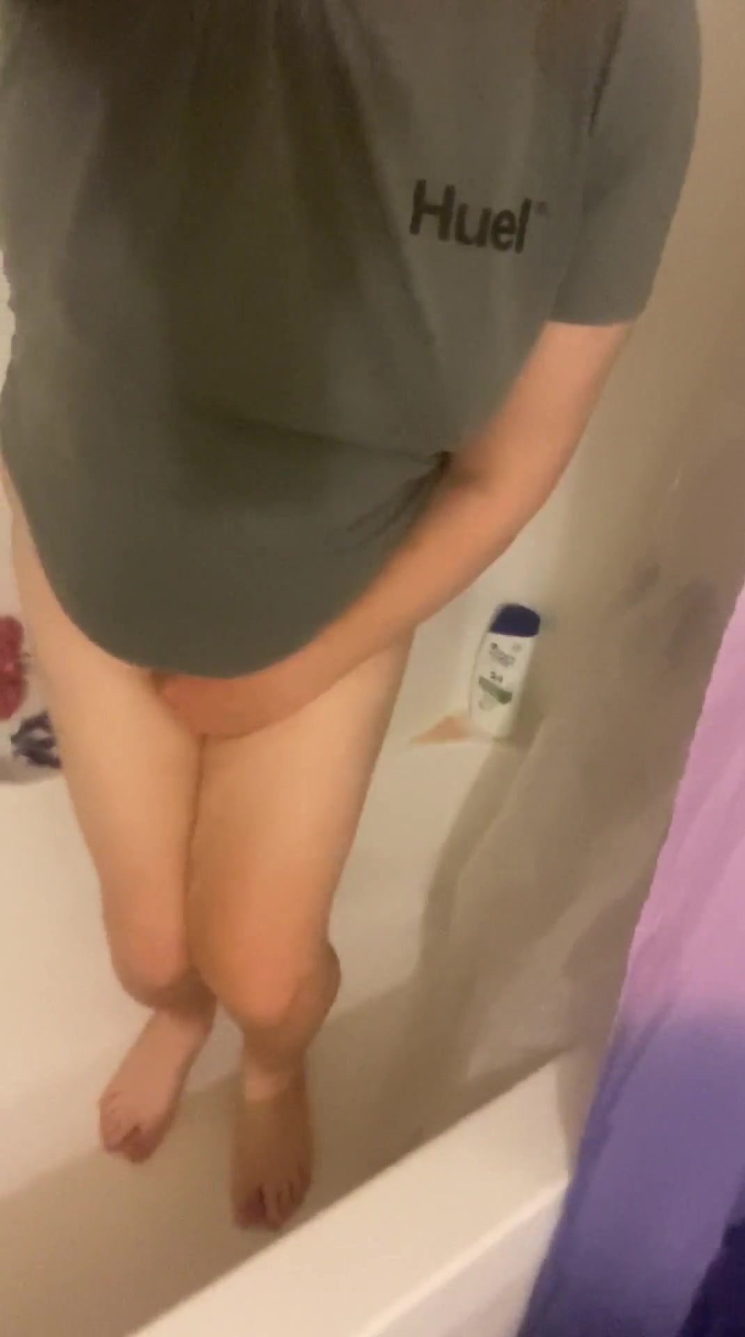 Tgirl with Cock-squeezing T-shirt, Abdomen, Innate Jugs Wets Her Undies in Douche, Standing, Sighs Strongly