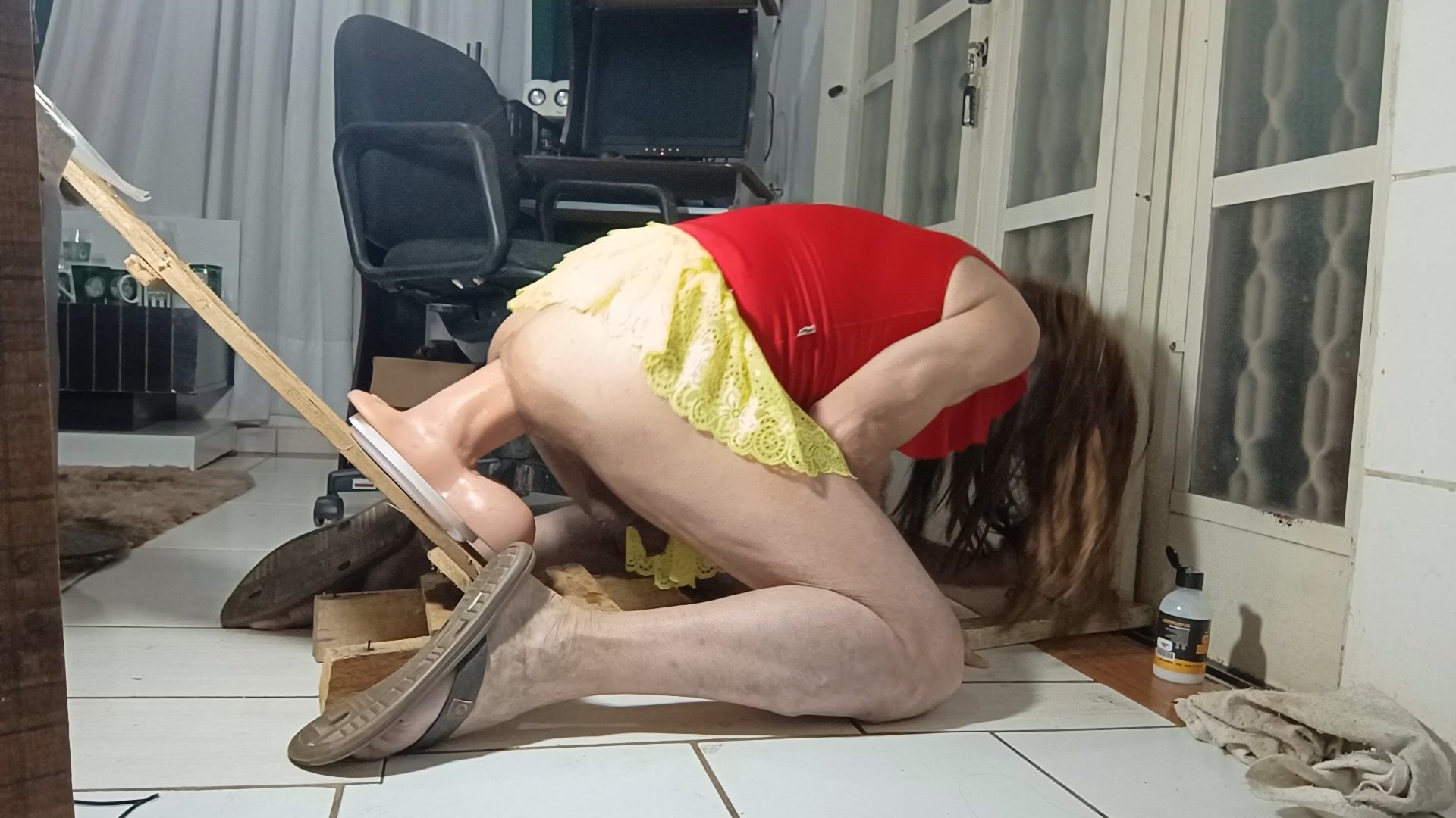 me coloquei de quatro e enterrei essa rola enorme em meu cu