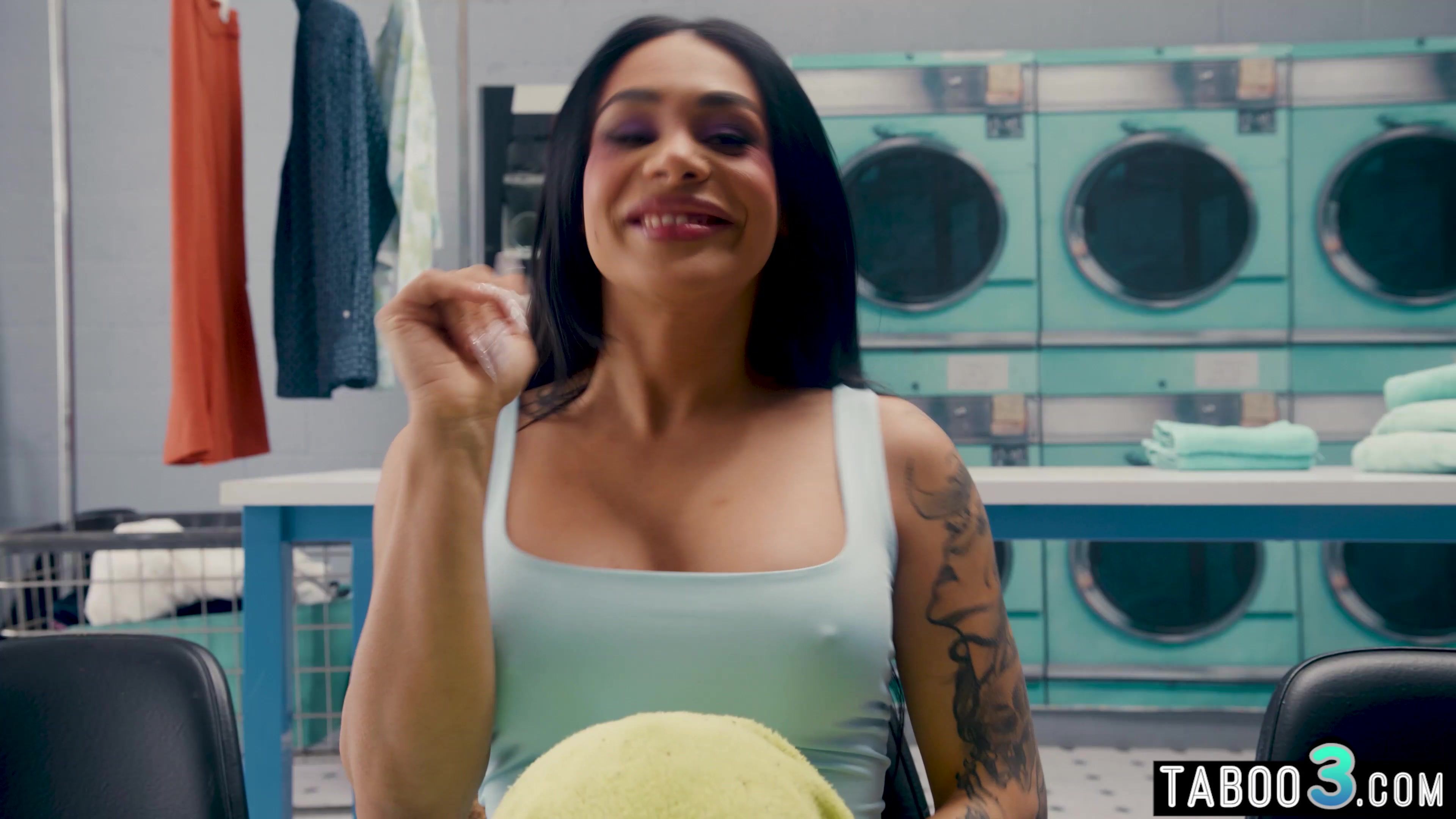 Nasty latina babe Hailey Rose notices a sexy latin trannys Eva Maxim throbbing dick at the public laundry and she cant resist she takes is to fuck it during waiting her clothes when a big booty inked asian slut Connie Perignon comes and she joins
