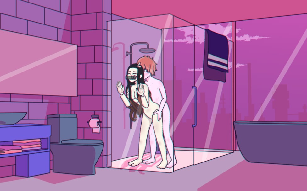 Nezuko Femboy toying with hard-on close up