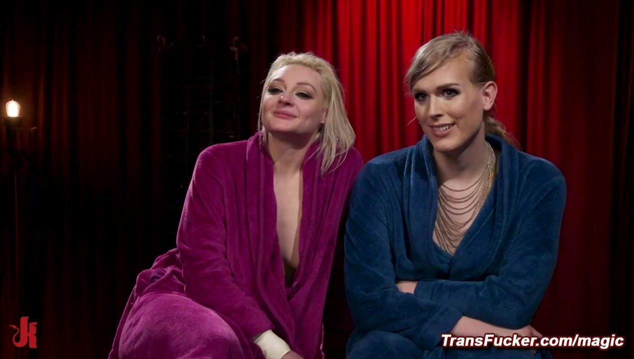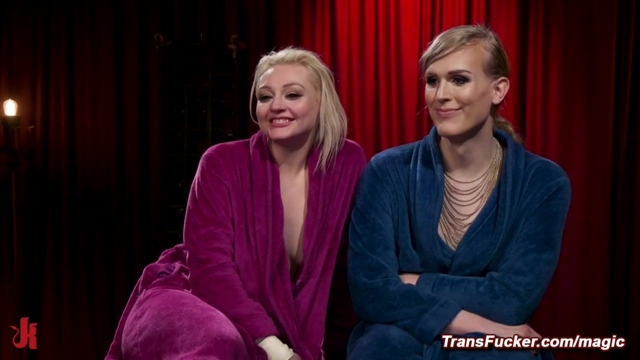 Arielle Aquinas a petite maid in tight latex is bound and blindfolded by shemale mistress Roxxie Moth then gets bastinado and anal fuck while choked with a leather belt from behind