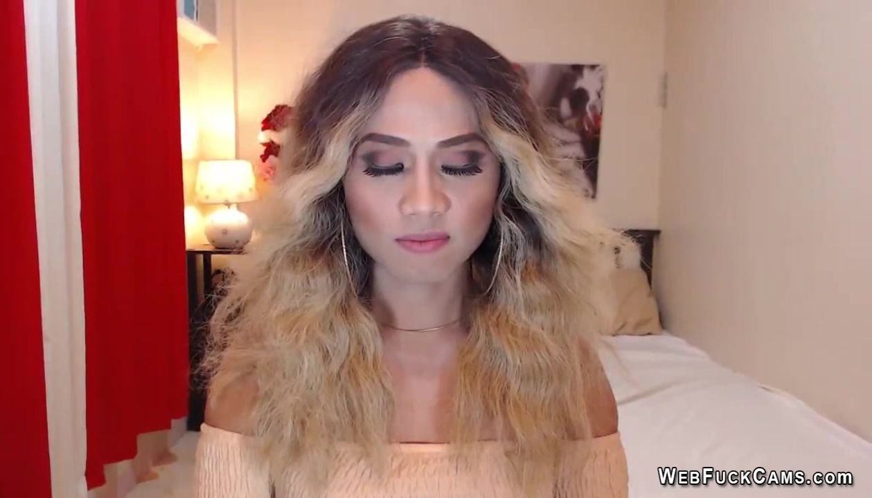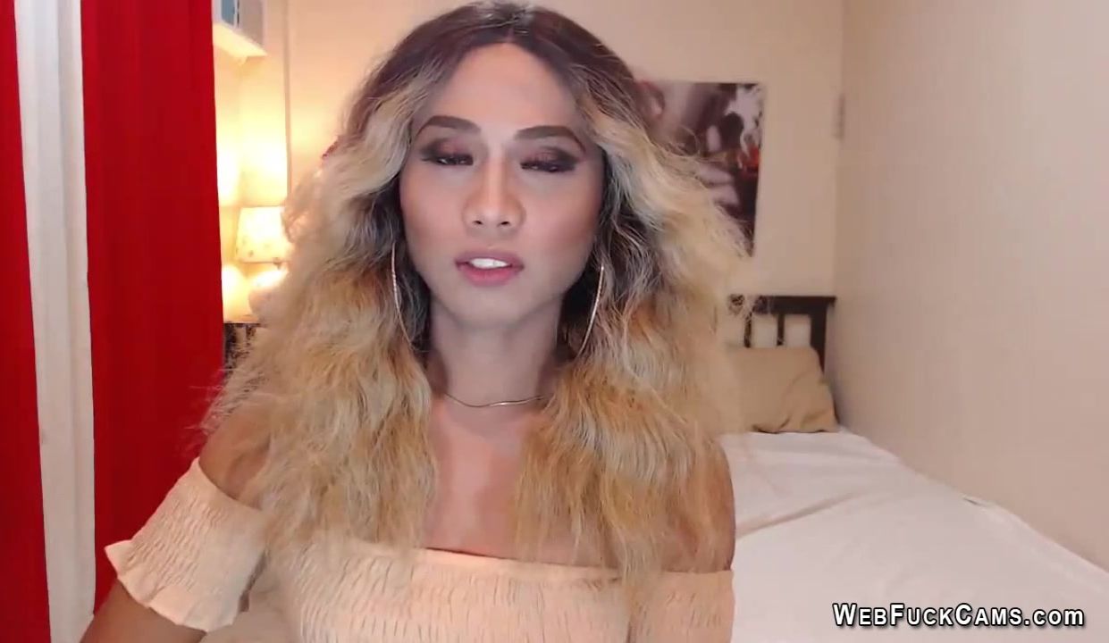 Super hot blonde amateur shemale TSQueenofPLEASURE strips off in front of webcam then masturbates in chair until cums in hand for her fans on solo show