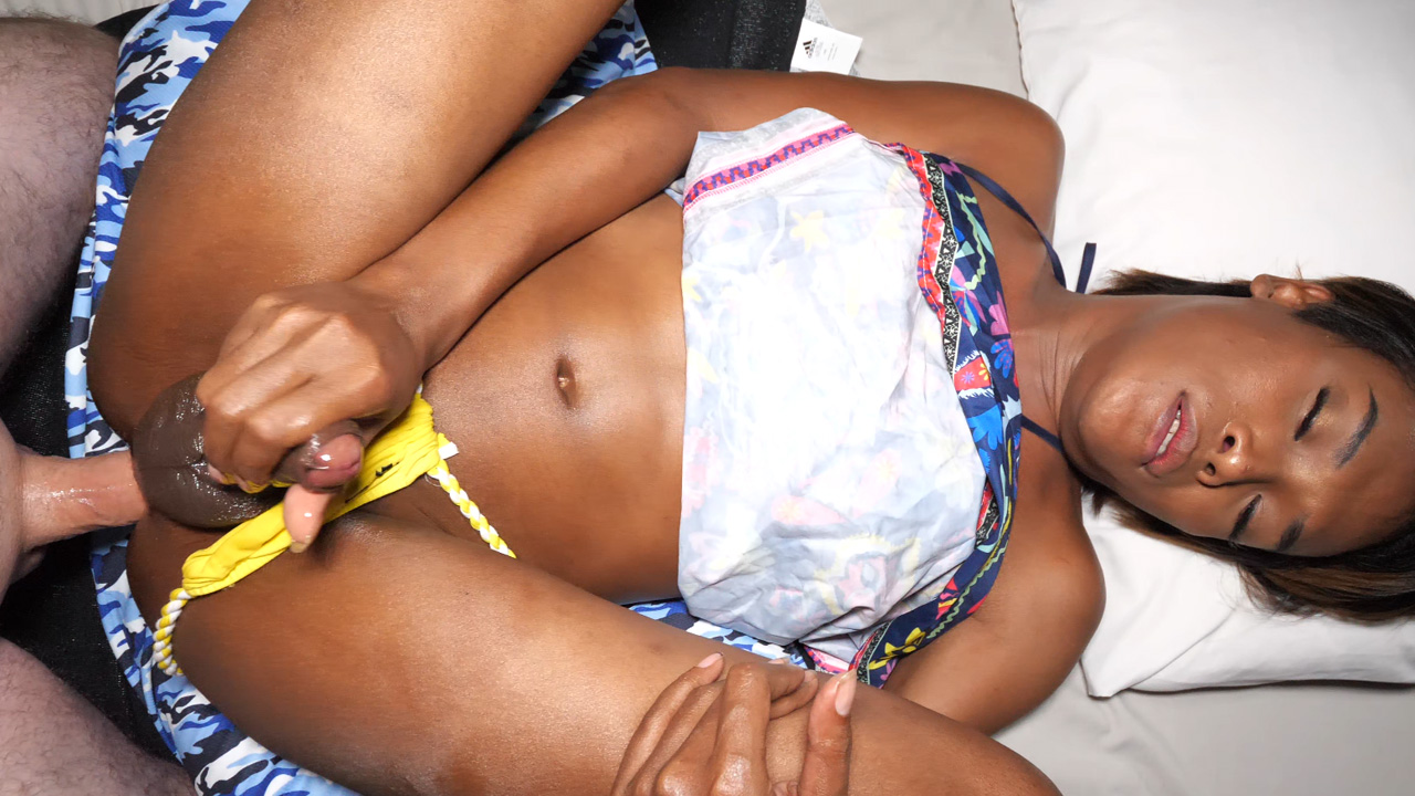 Naughty amateur Thai ladyboy with big boobs is oiling her tanned cock and starts masturbating when her european lover comes The view makes him horny so he orders his to satisfy her throbbing white cock