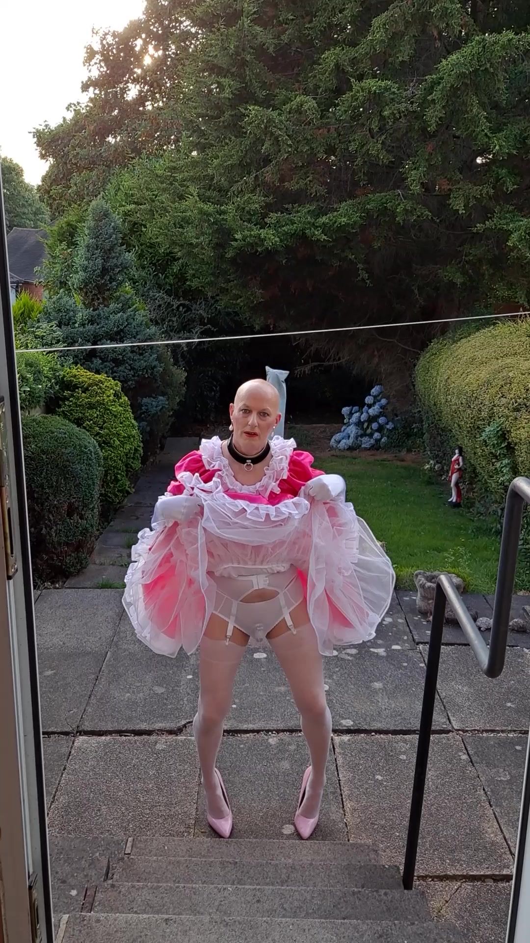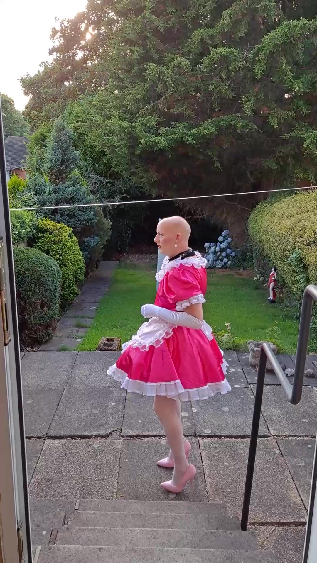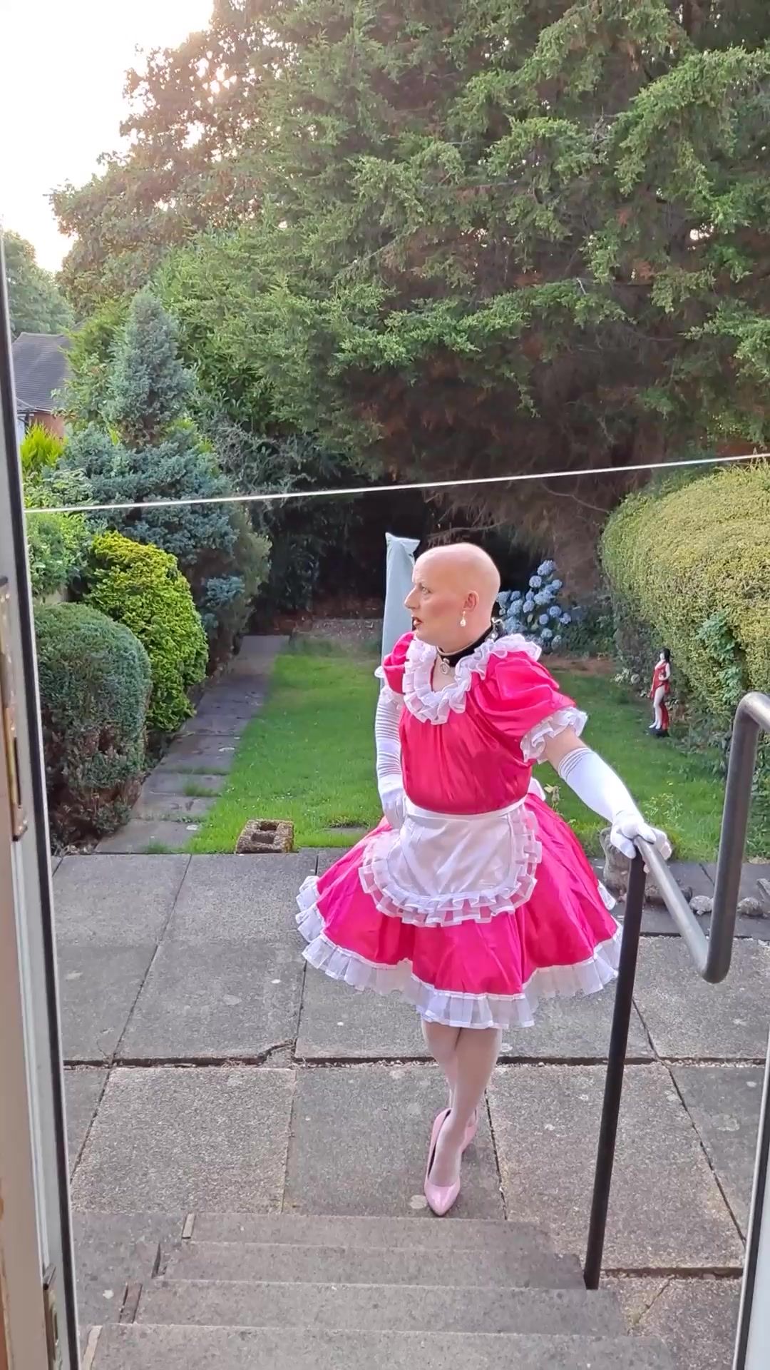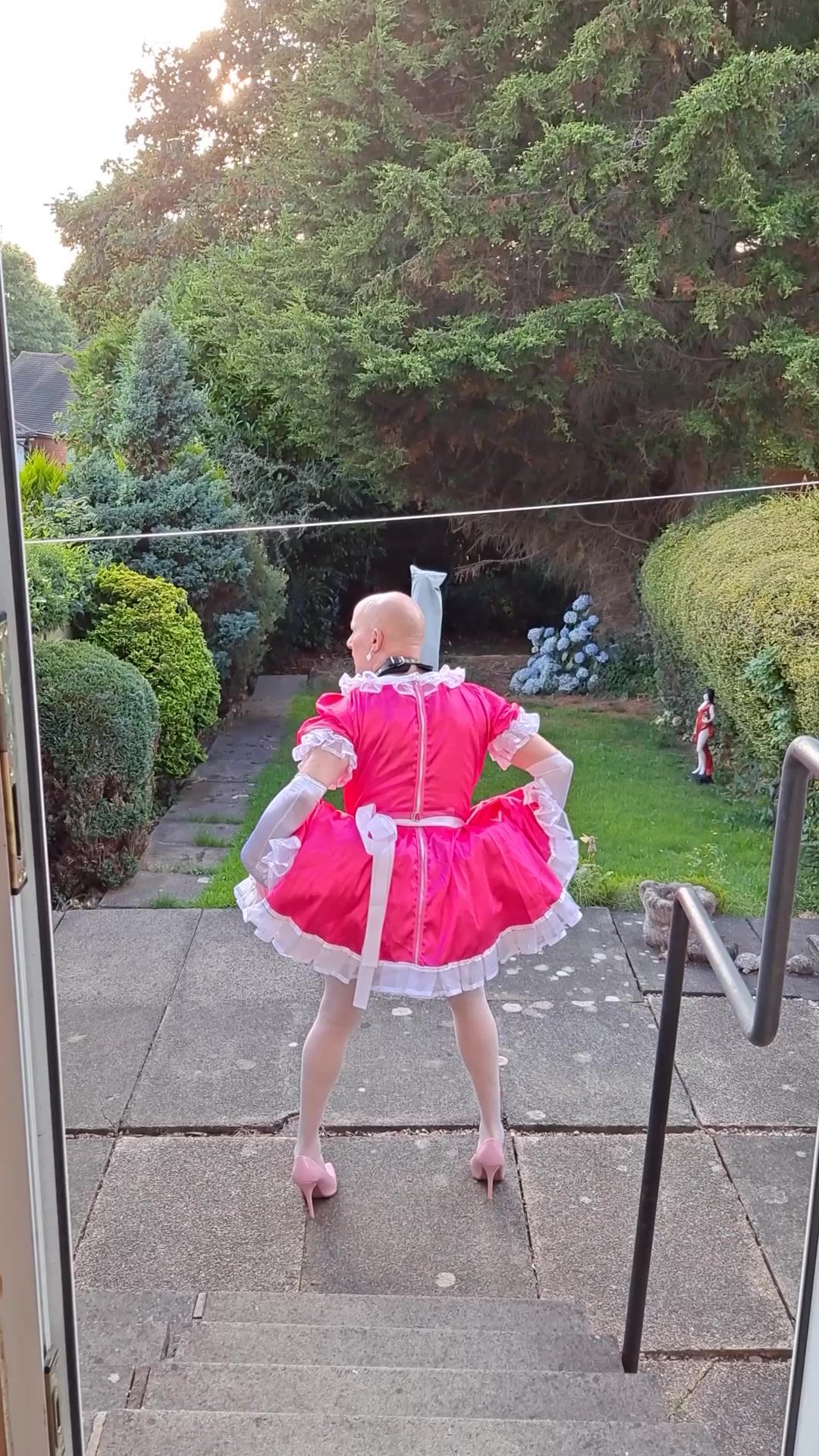 EXPOSING MYSELF WEARING A PINK SISSY MAIDS DRESS, STOCKINGS AND HEELS IN MY BACK GARDEN.